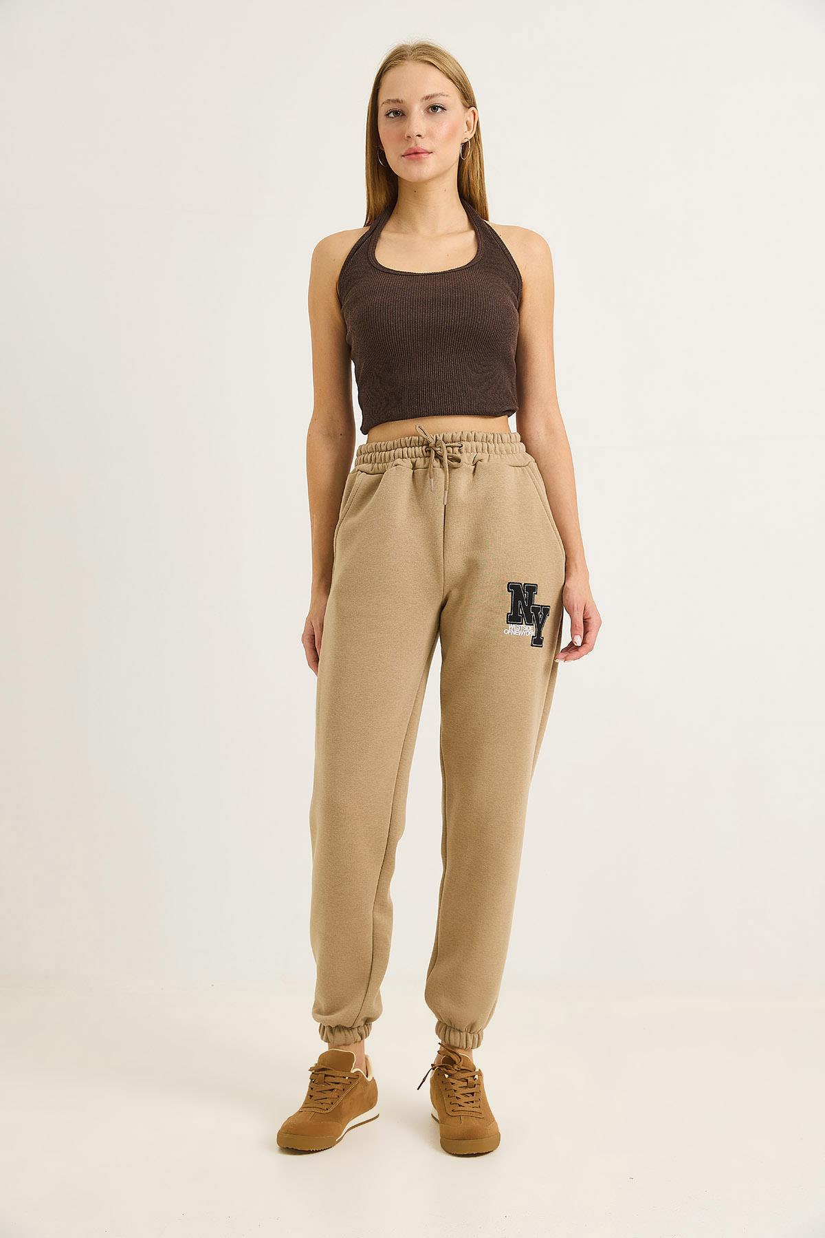 3 İp Şardonlu Bileği Lastikli Nakışlı  Vizon Eşofman