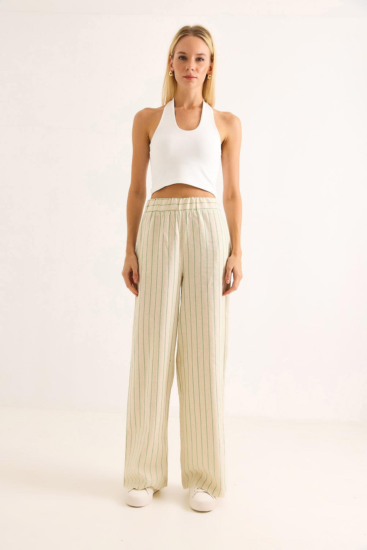Çizgi Desenli Bol Paçalı Keten Pantolon YEşil (250584PNTXYSL1)