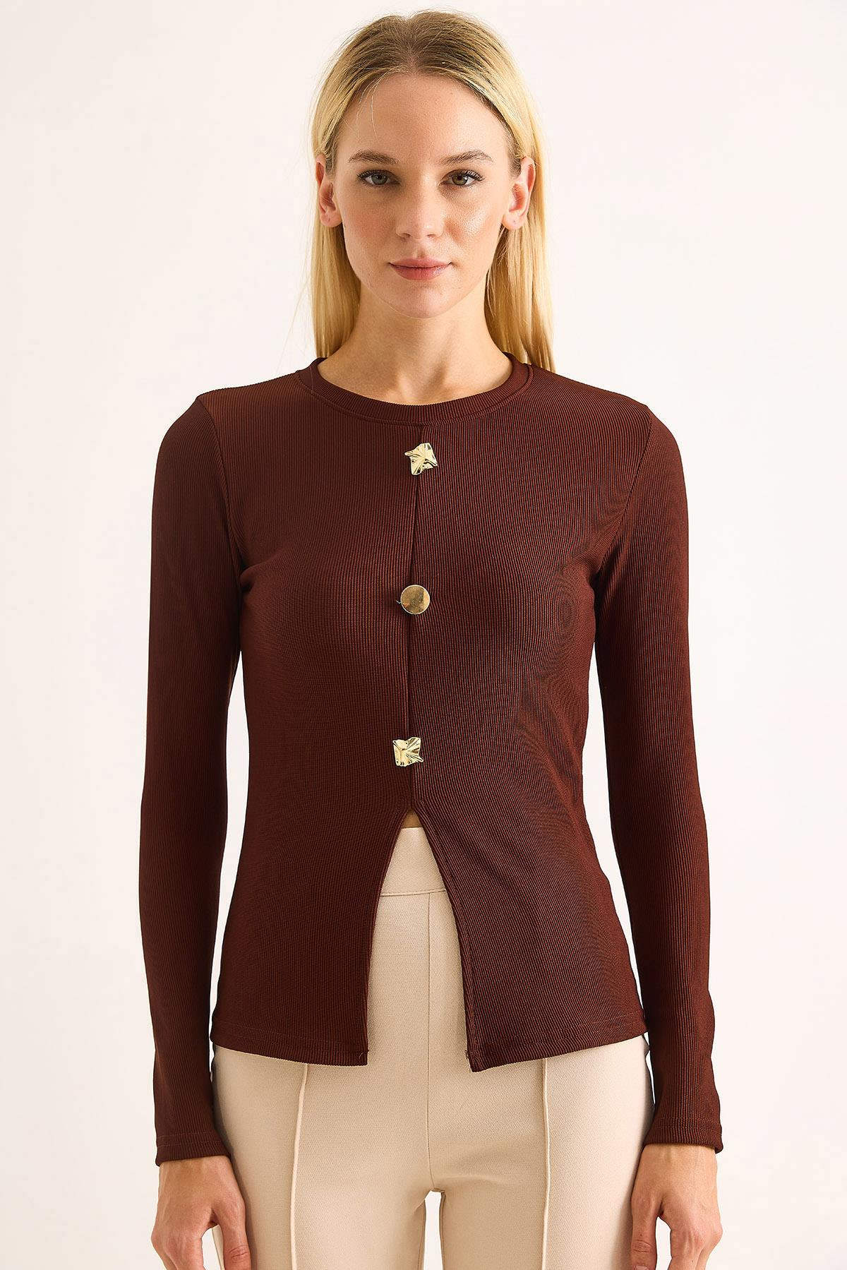 Gold Düğmeli Yırtmaçlı Bluz Kahverengi (500760BLZXKHV)