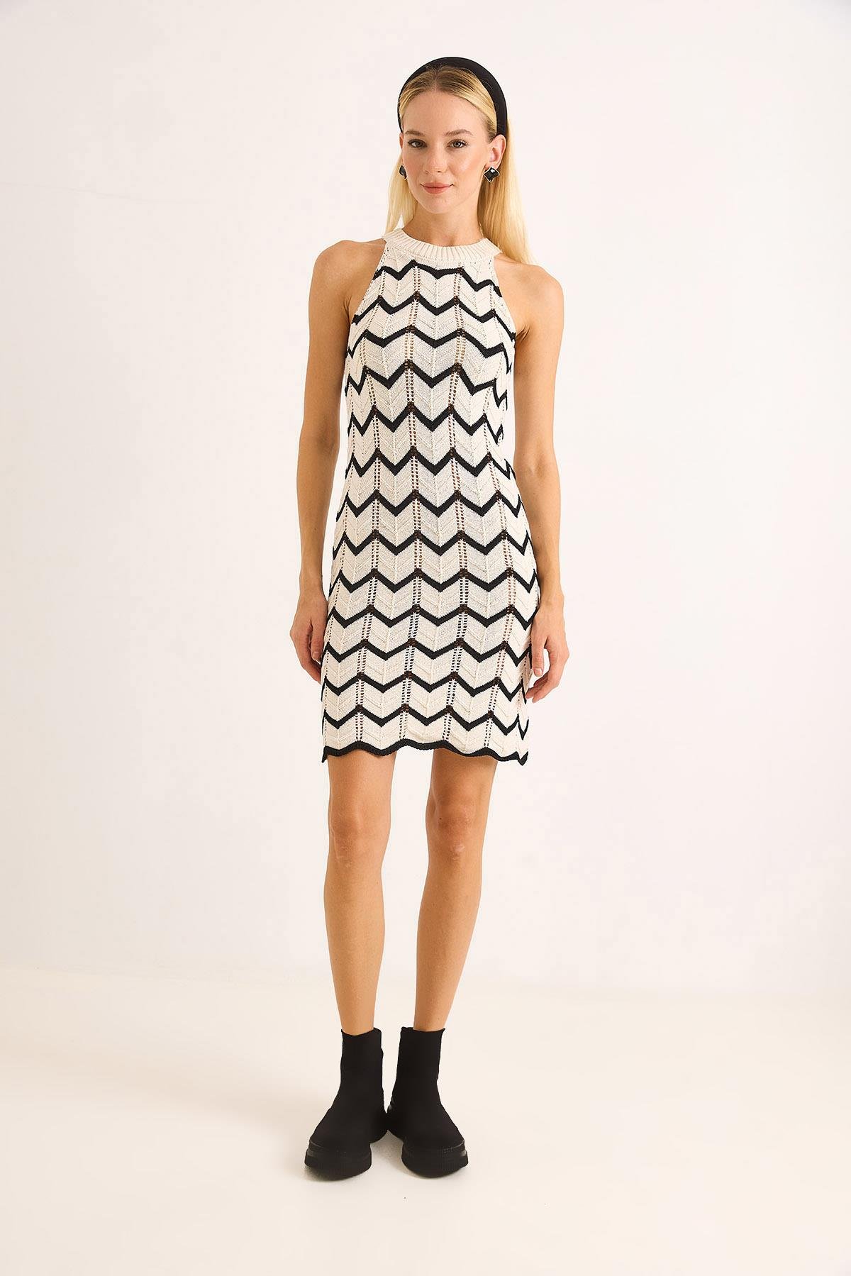 Halter Yaka Ajurlu Mini Elbise Astarsız Siyah