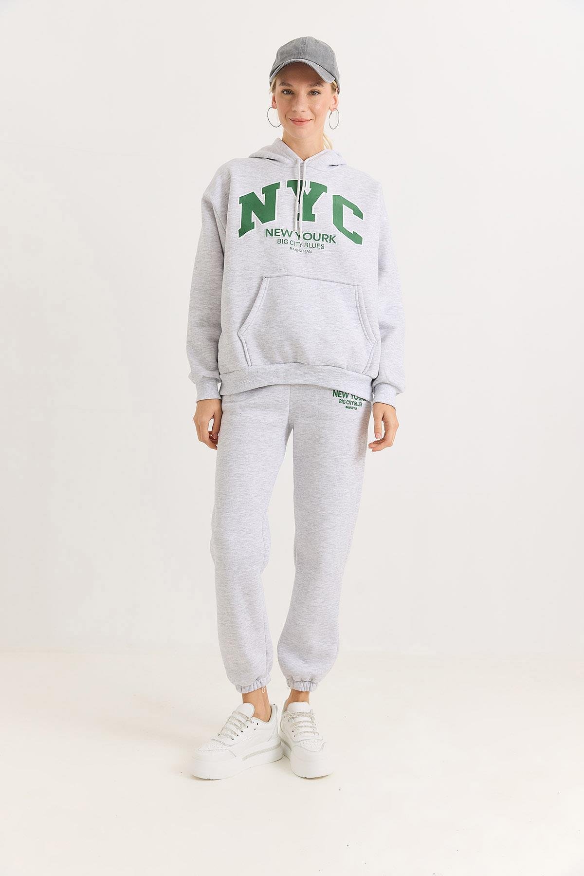 Kadın Baskılı Üç İplik Şardonlu Eşofman Takımı Gri