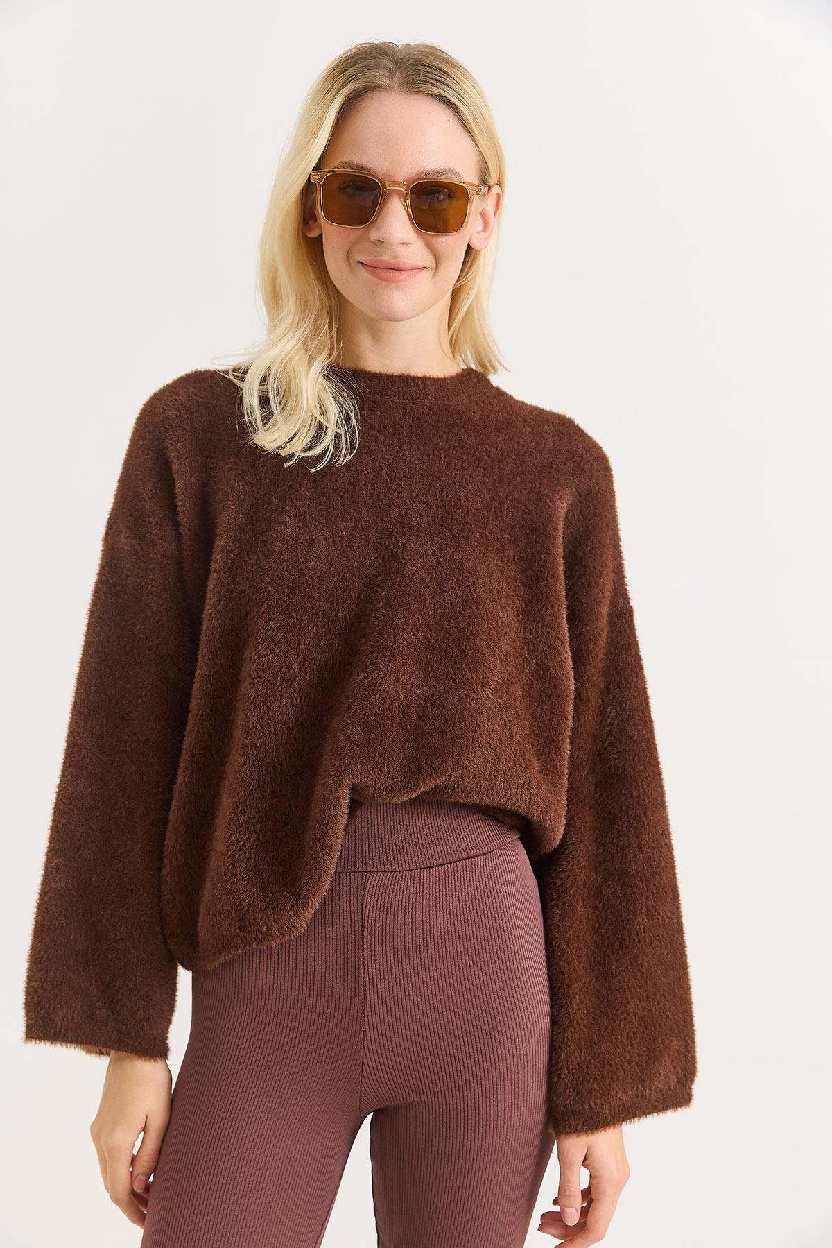 Kadın Bisiklet Yaka Oversize Yumuşak Tüylü Kahverengi