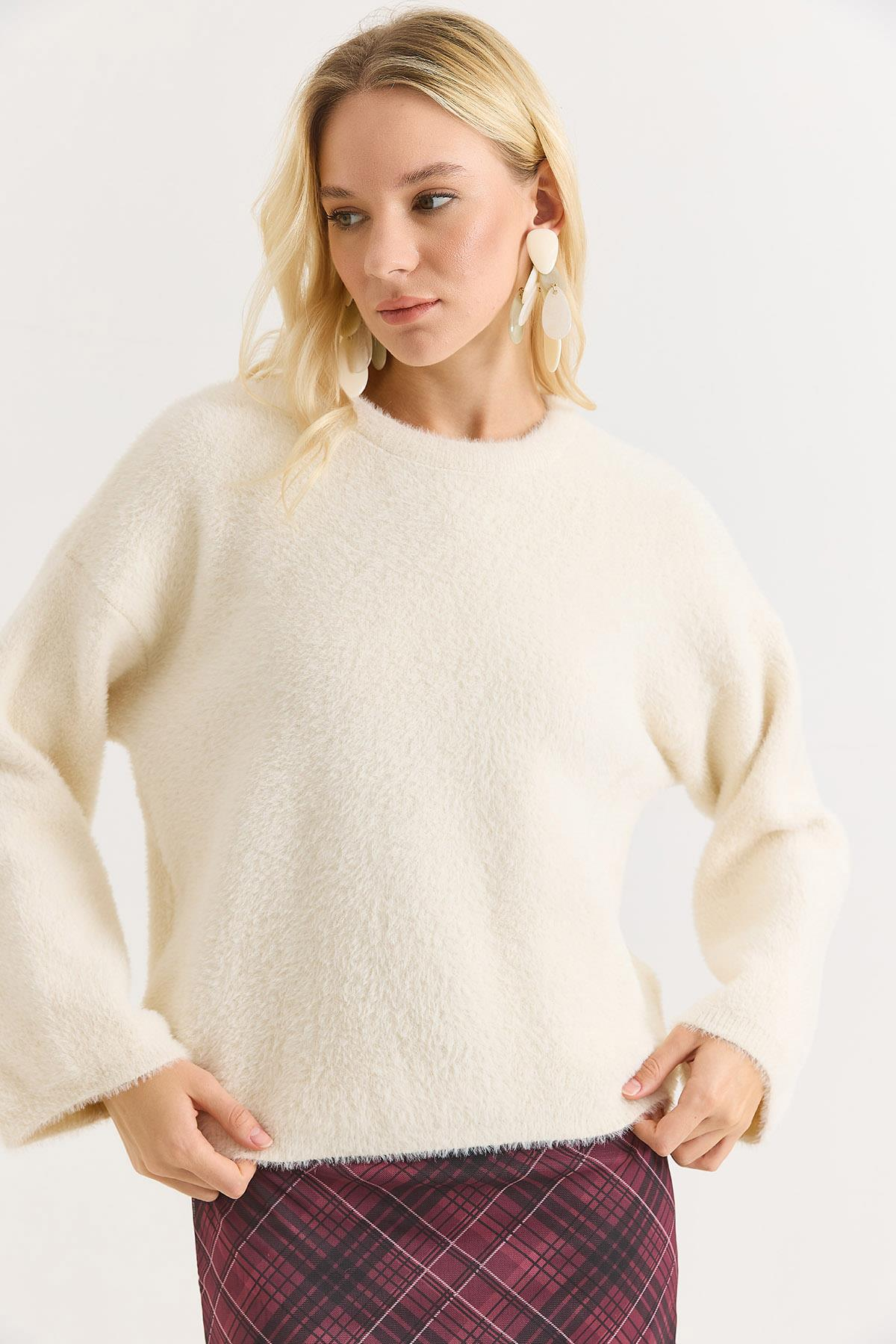Kadın Bisiklet Yaka Oversize Yumuşak Tüylü Kazak Bej (500786KZKXBEJ)