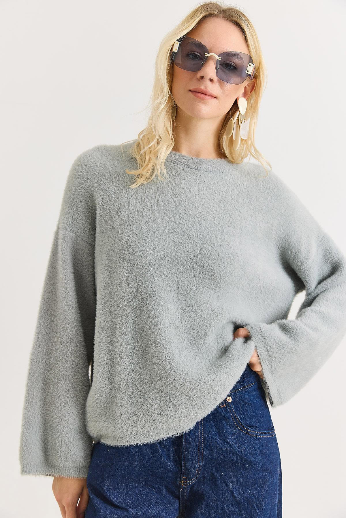 Kadın Bisiklet Yaka Oversize Yumuşak Tüylü Kazak Gri (500786KZKXGRİ)