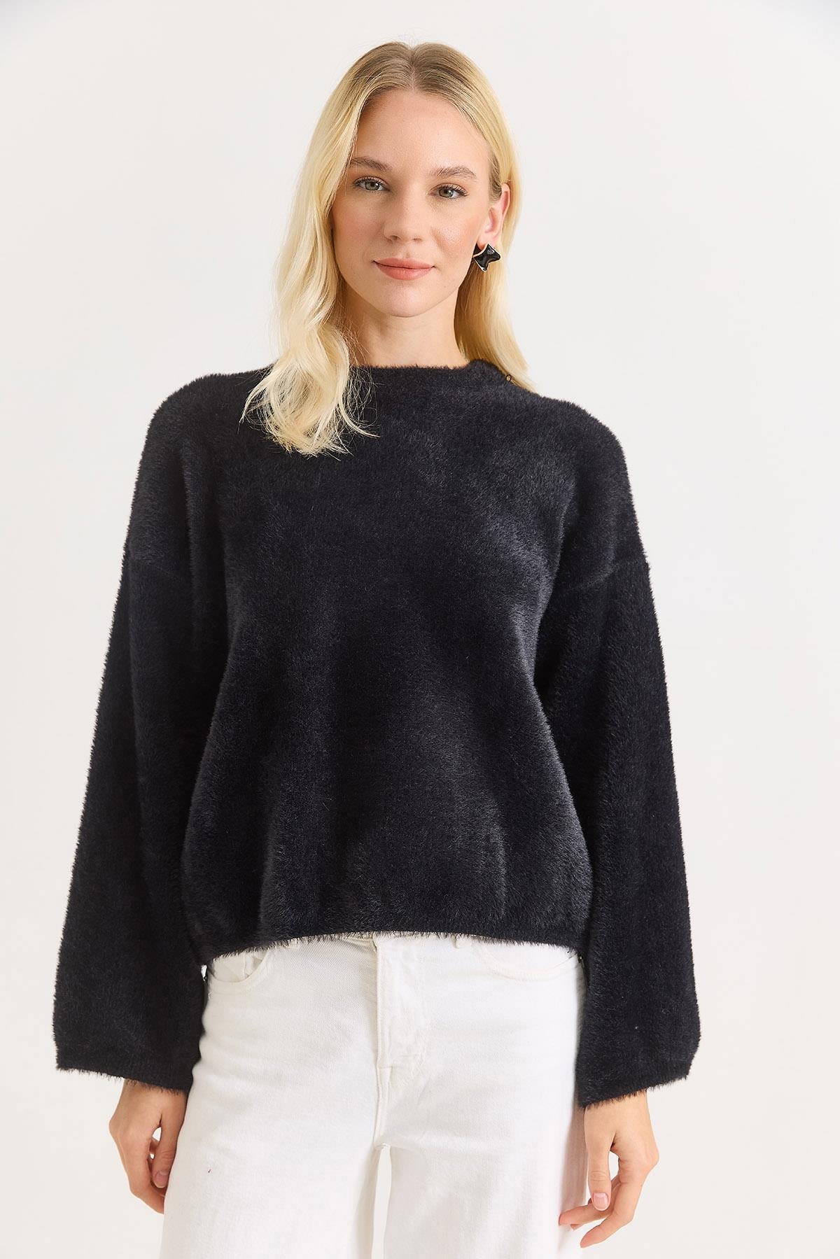 Kadın Bisiklet Yaka Oversize Yumuşak Tüylü Kazak Siyah (500786KZKXSYH)