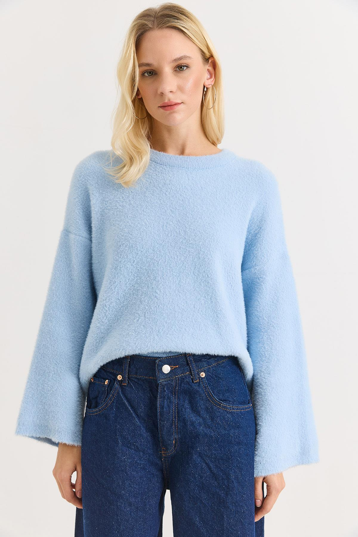 Kadın Bisiklet Yaka Oversize Yumuşak Tüylü Mavi (500786KZKXMAVİ)