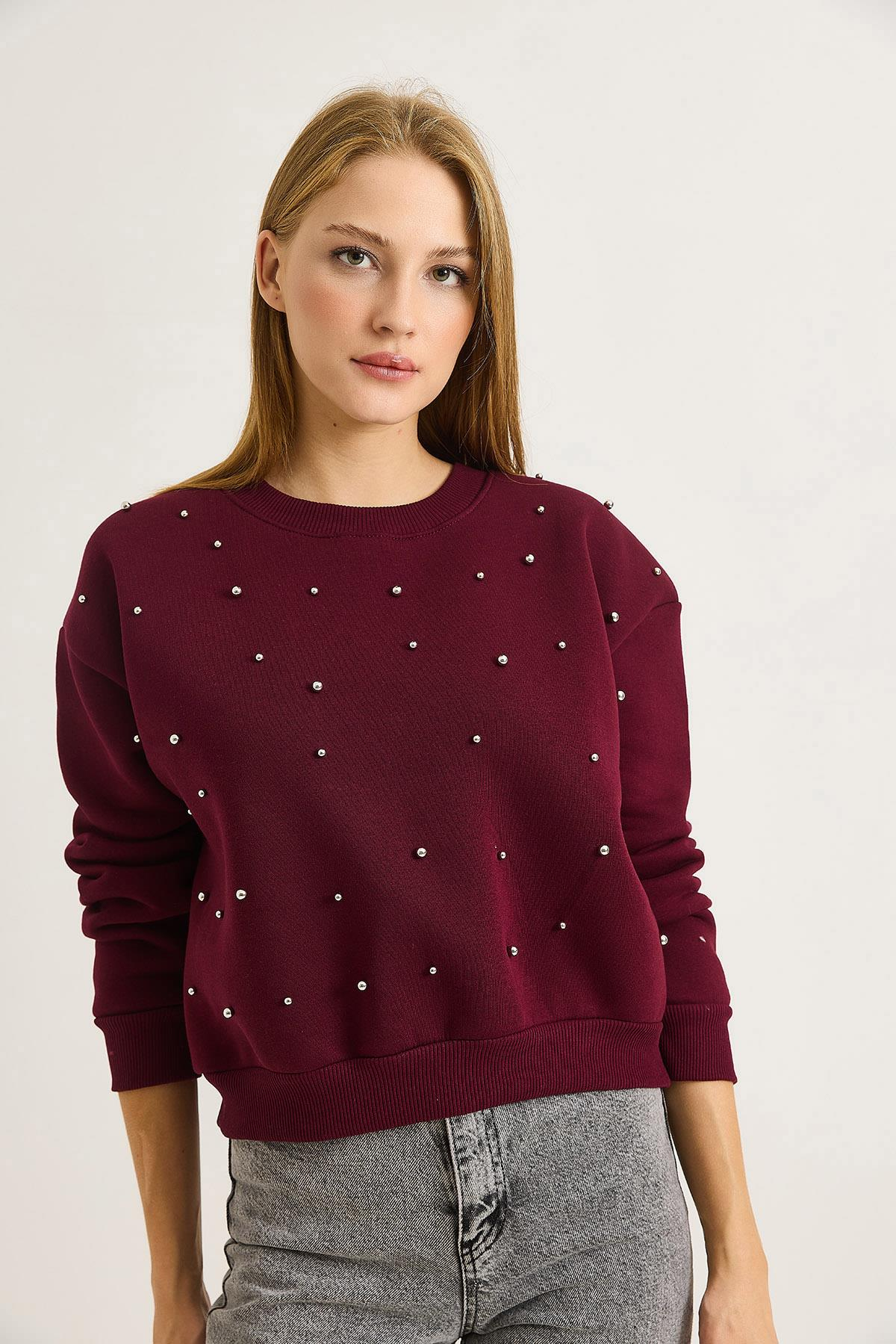 Kadın Bisiklet Yaka Taşlı Üç İplik Swet Bordo