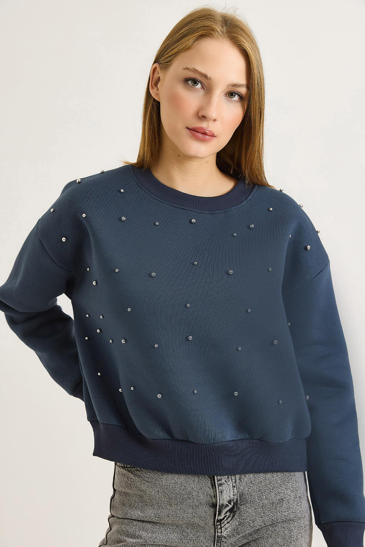 Kadın Bisiklet Yaka Taşlı Üç İplik Swet Füme (500738SWTXFME)