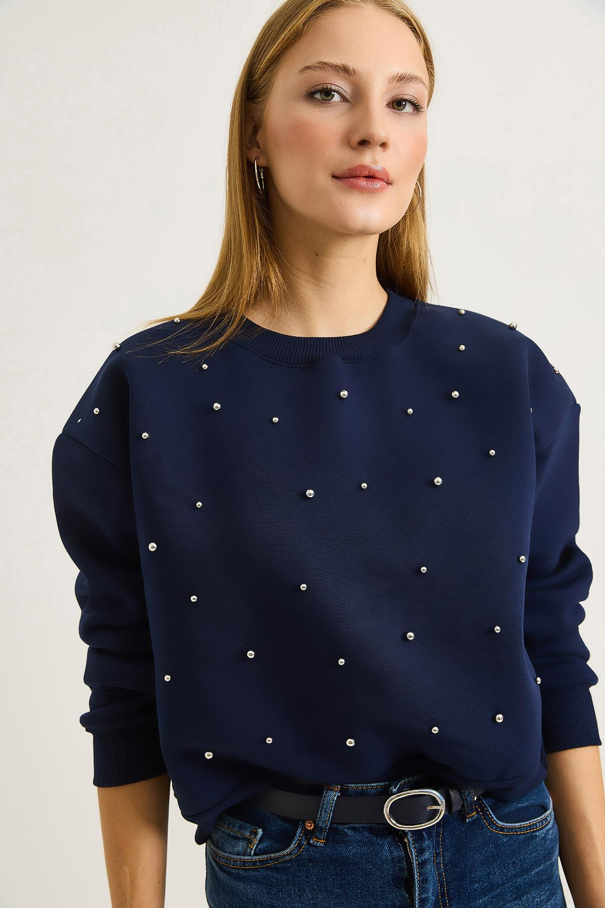 Kadın Bisiklet Yaka Taşlı Üç İplik Swet Lacivert