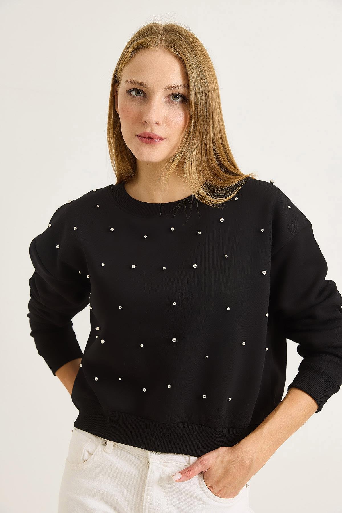 Kadın Bisiklet Yaka Taşlı Üç İplik Swet Siyah