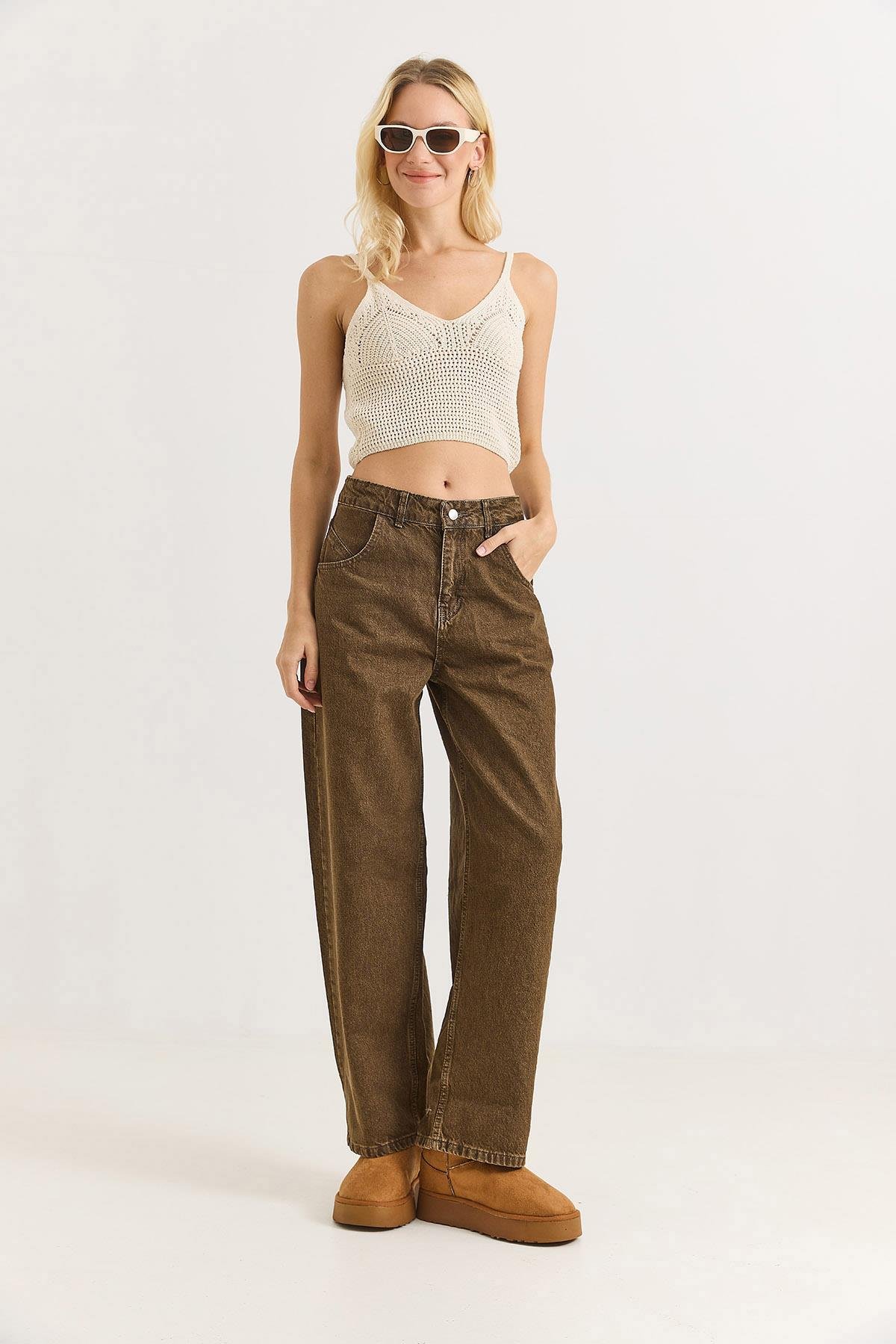Kadın Bol Paça Kot Pantalon  Kahverengi