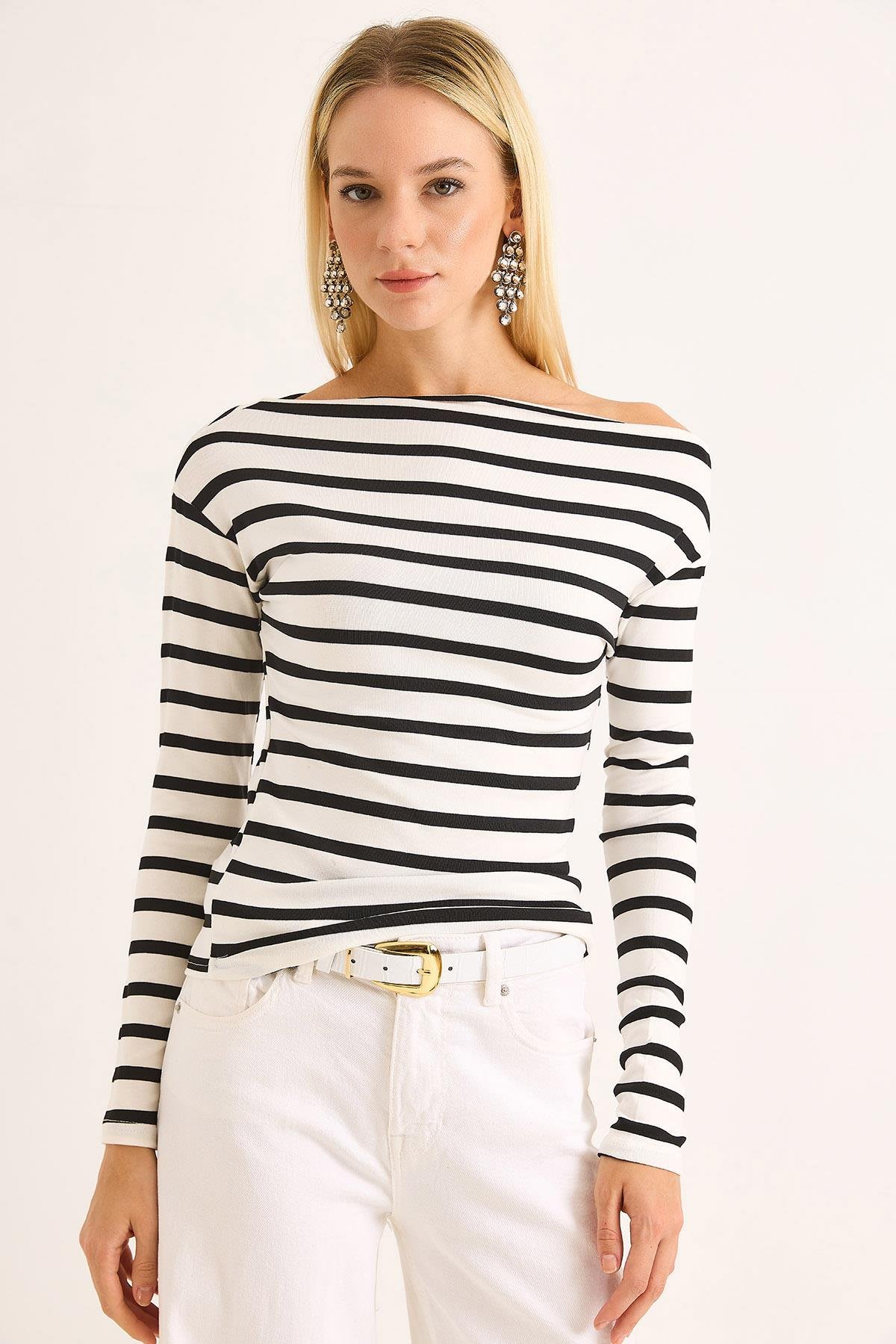 Kadın Çizgi Desen Geniş Yaka Uzun Kollu Bluz Siyah (251300BLZXSYH)