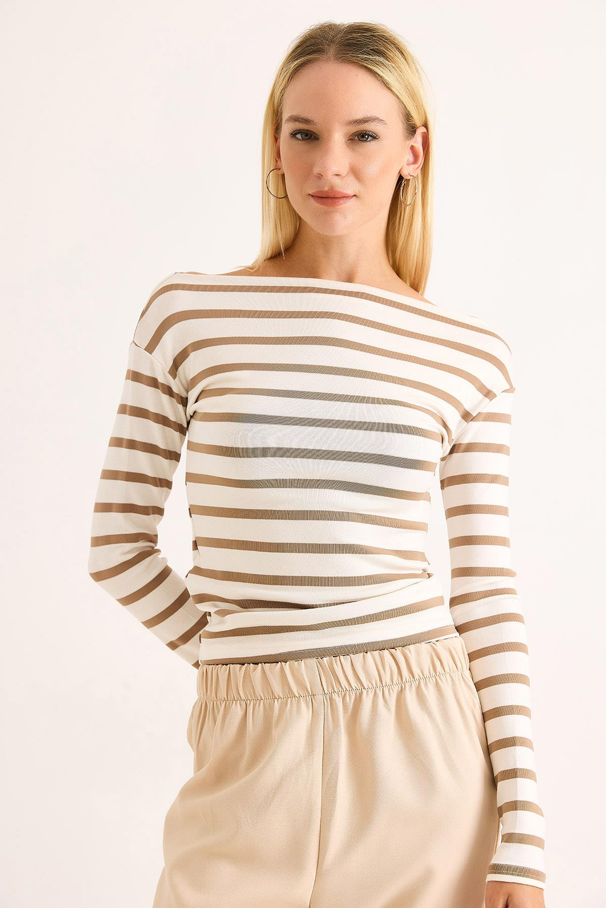 Kadın Çizgi Desen Geniş Yaka Uzun Kollu Bluz Sütlü Kahve (251300BLZXSKHV)