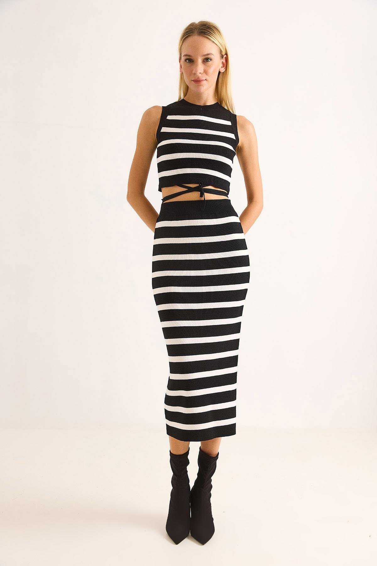 Kadın Çizgi Desenli Etek Crop İp Bağlamalı Siyah Takım (500768TKMXSYH)