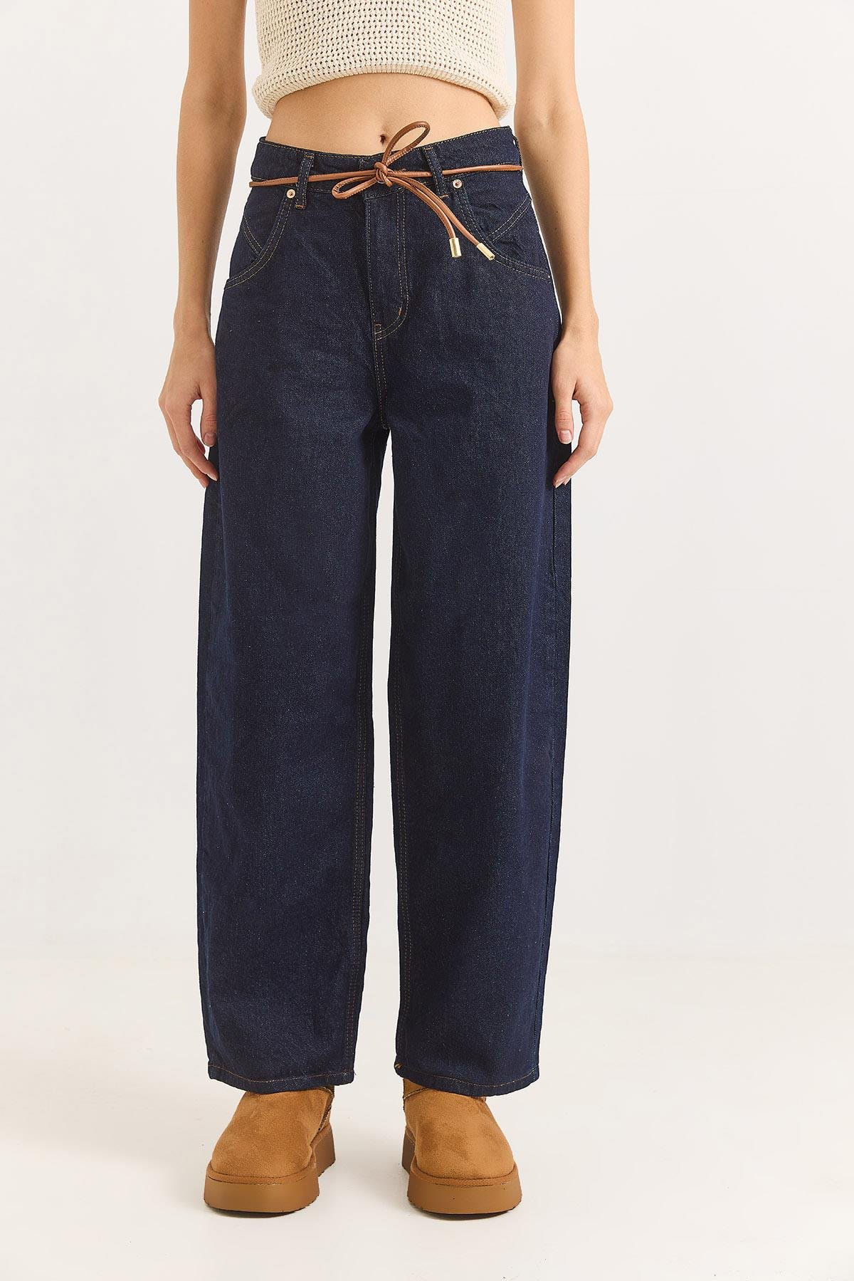 Kadın Deri Kemerli Bol Paça Kot Pantalon Lacivert (500804KOTXLCV)