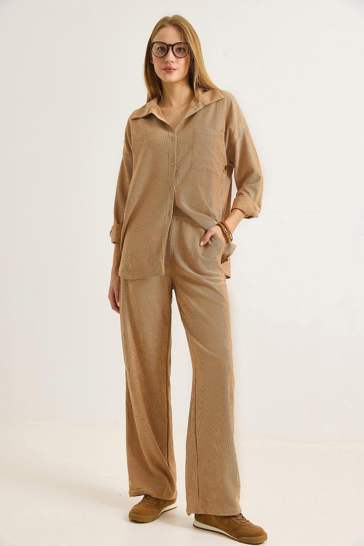 Kadın Fitilli Örme Gömlekli Takım Antrasit Vizon (500737TKMXVZN)