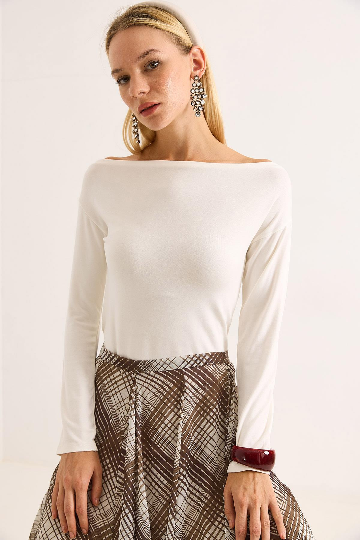 Kadın Geniş Yaka Uzun Kollu Bluz Beyaz