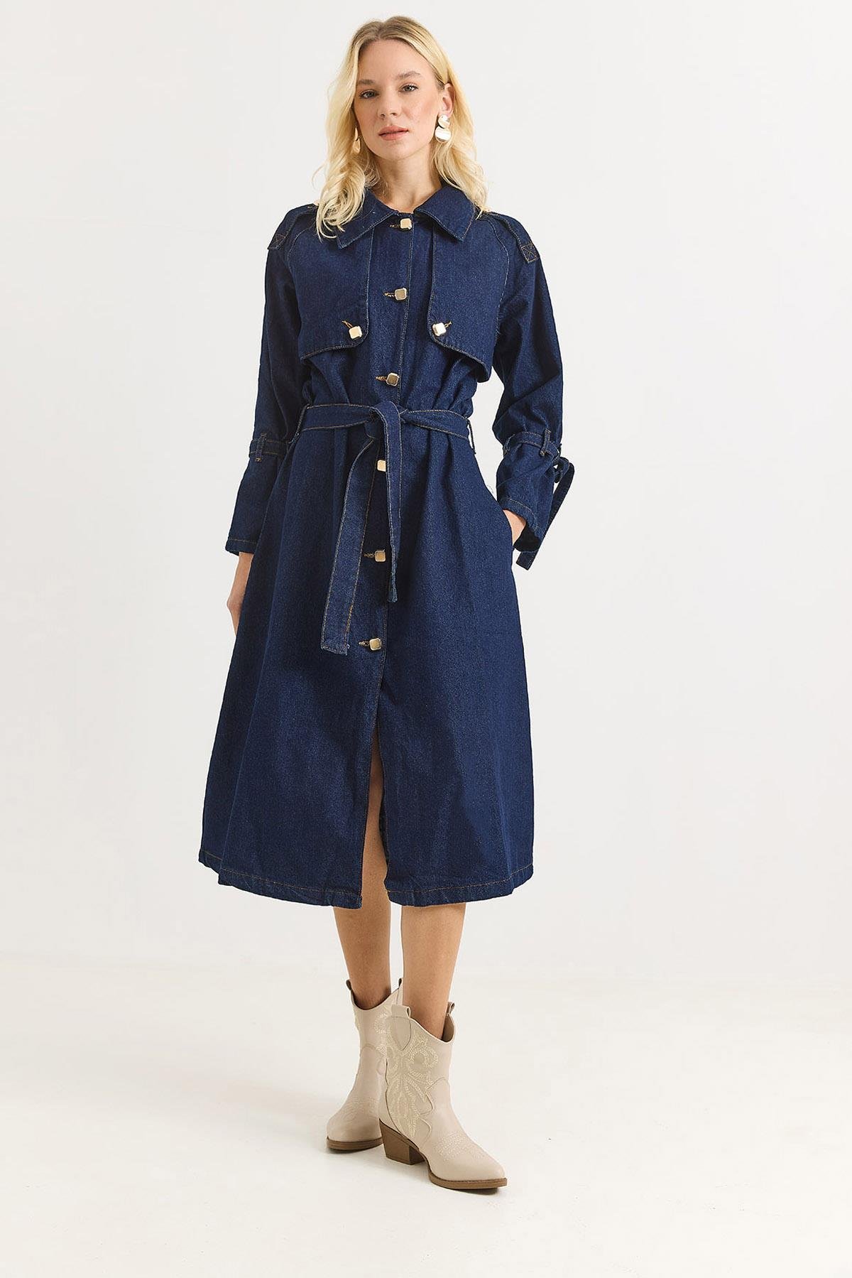 Kadın Gold Düğmeli Apoletli Kot   Elbise