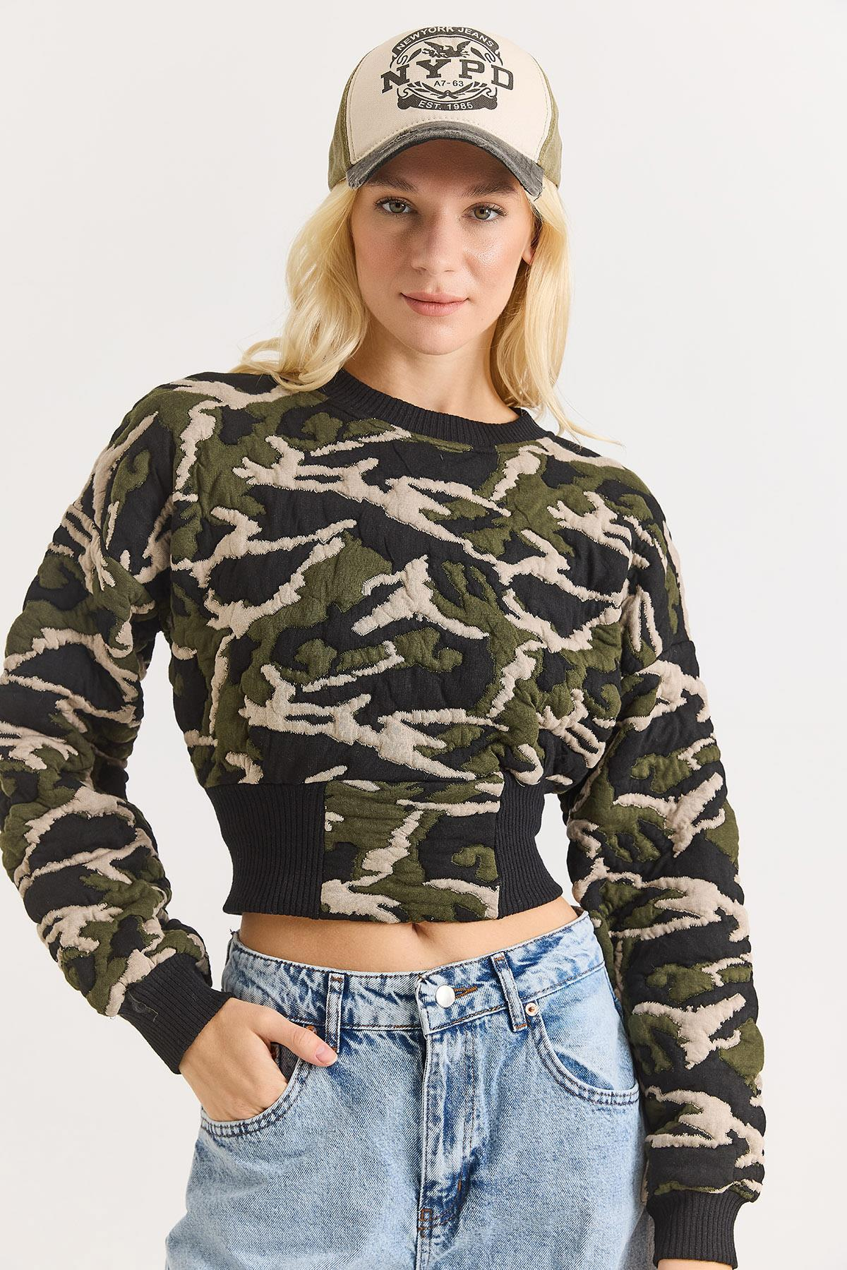 Kadın Haki Kamuflaj Crop Swet (500797SWTXSYH)