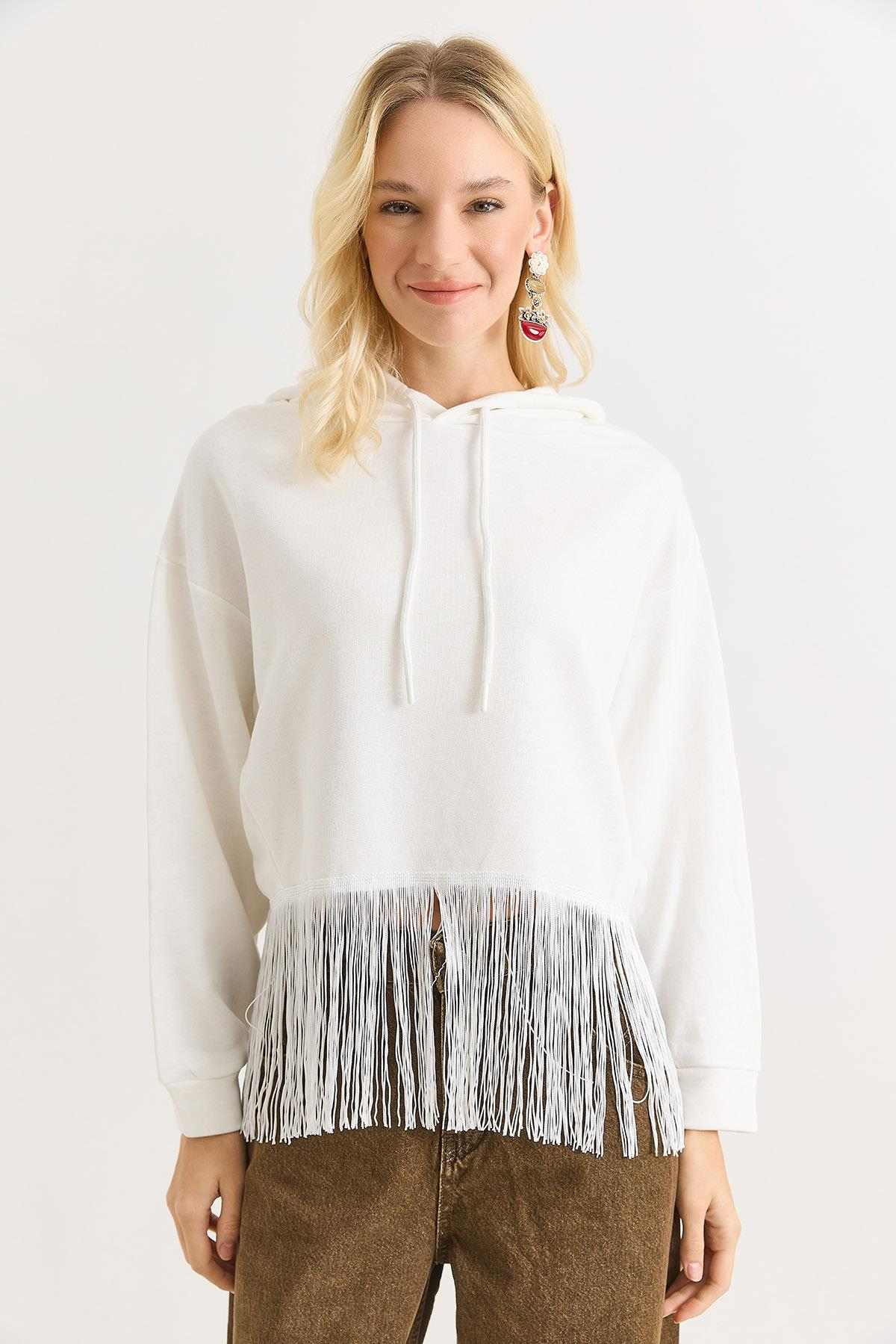Kadın İp Saçaklı Kapuşonlu Sweatshirt Beyaz