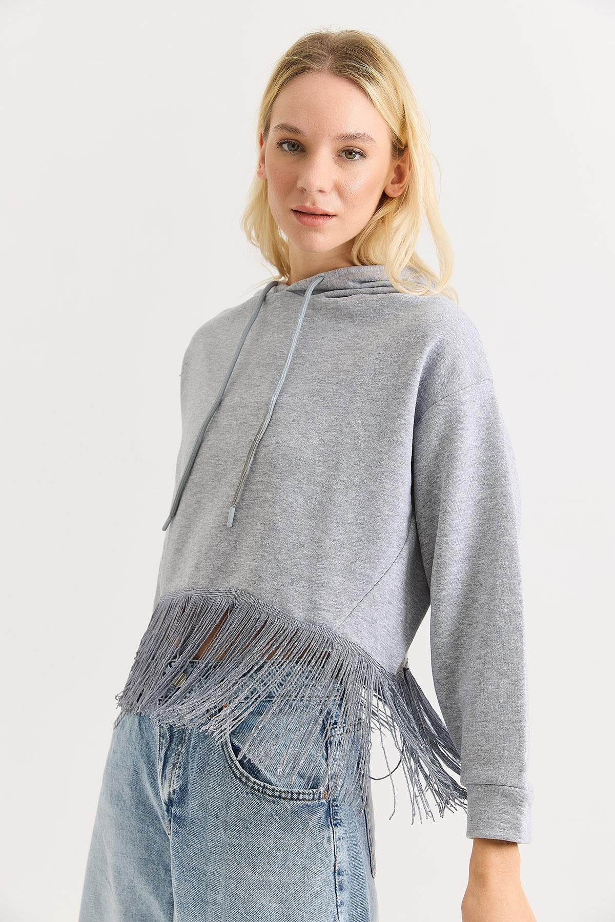 Kadın İp Saçaklı Kapuşonlu Sweatshirt Gri (500791SWTXGRİ)