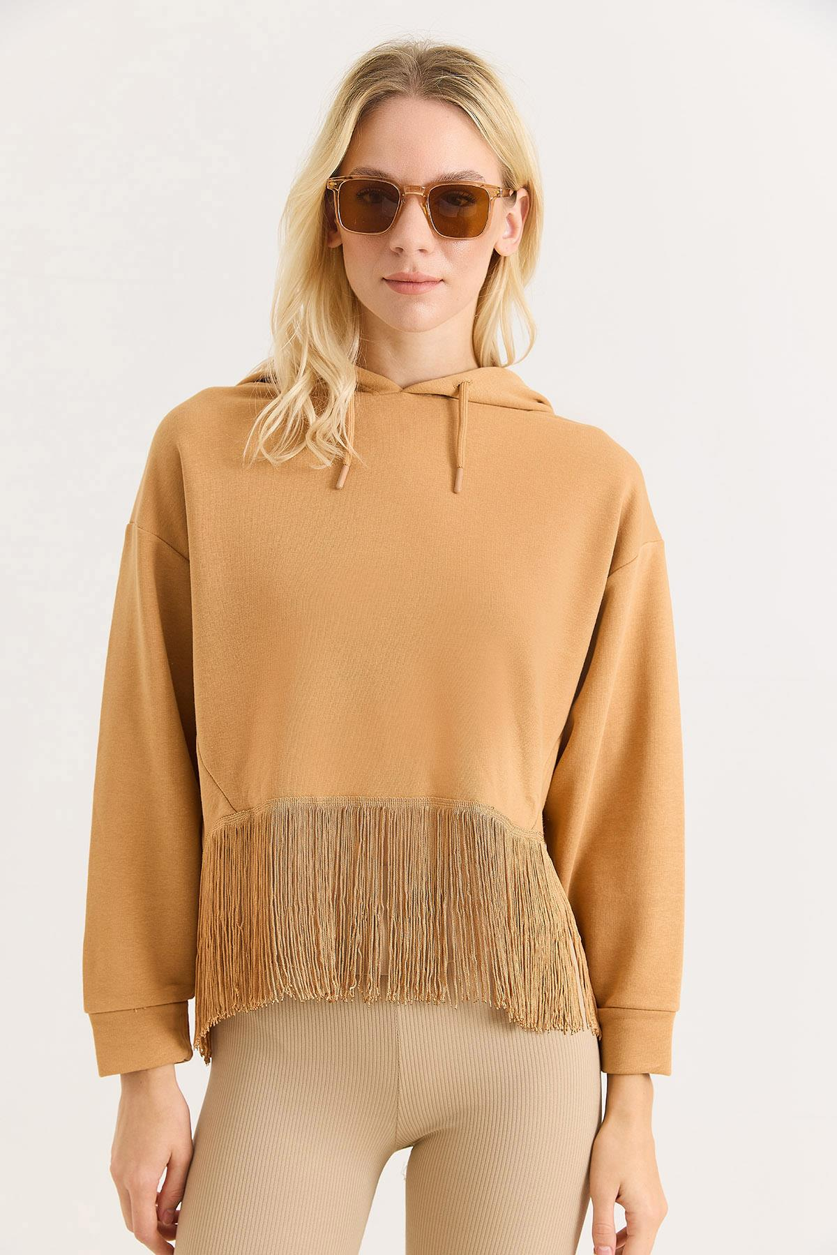 Kadın İp Saçaklı Kapuşonlu Sweatshirt Vizon