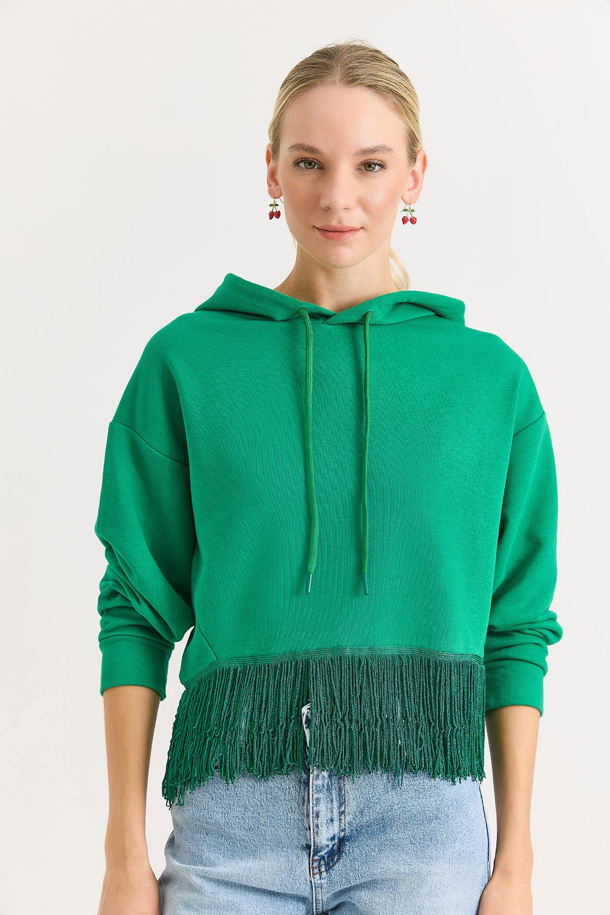Kadın İp Saçaklı Kapuşonlu Sweatshirt Yeşil