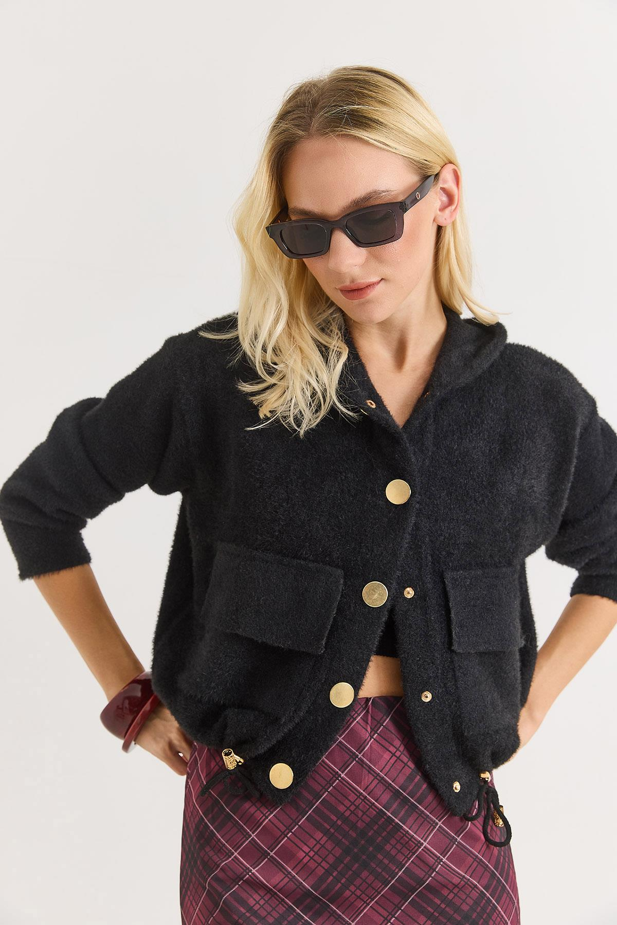 Kadın Kapişonlu Cepli Gold Düğmeli Yumuşşak Tüylü Hırka Siyah (500800HRKXSYH)
