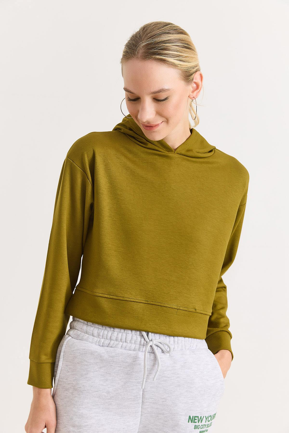 Kadın Kapişonlu Düz Rahat Swet Yağ Yeşili (500790SWTXYYŞL)