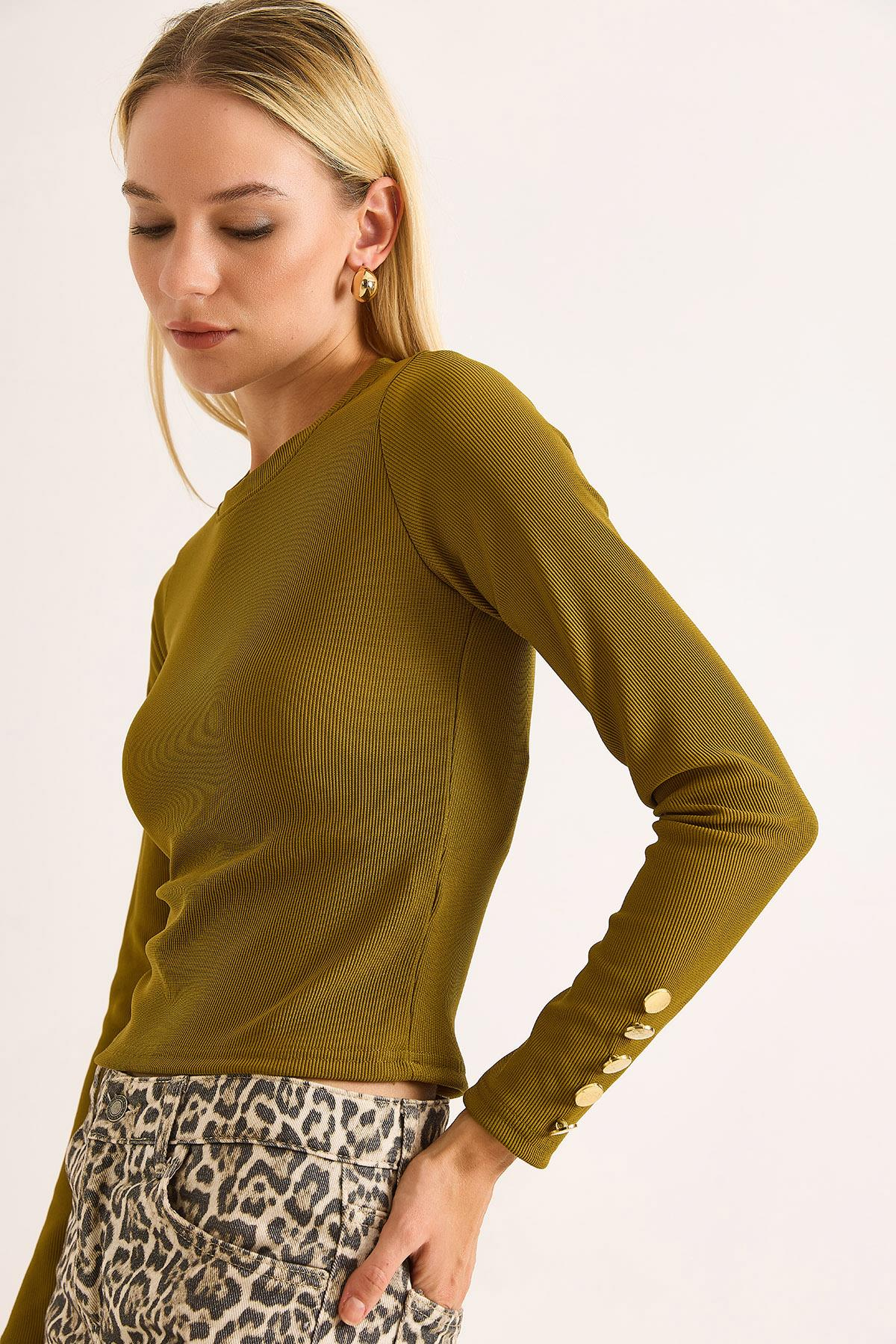 Kadın Kolları Düğme Detaylı Şık  Bluz Haki