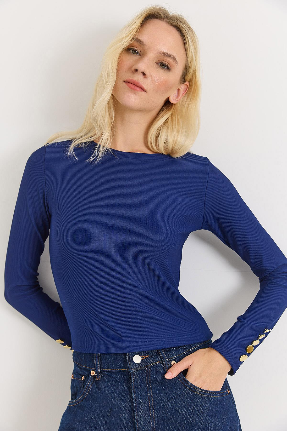 Kadın Kolları Düğme Detaylı Şık Bluz Lacivert (500765BLZXLCV)