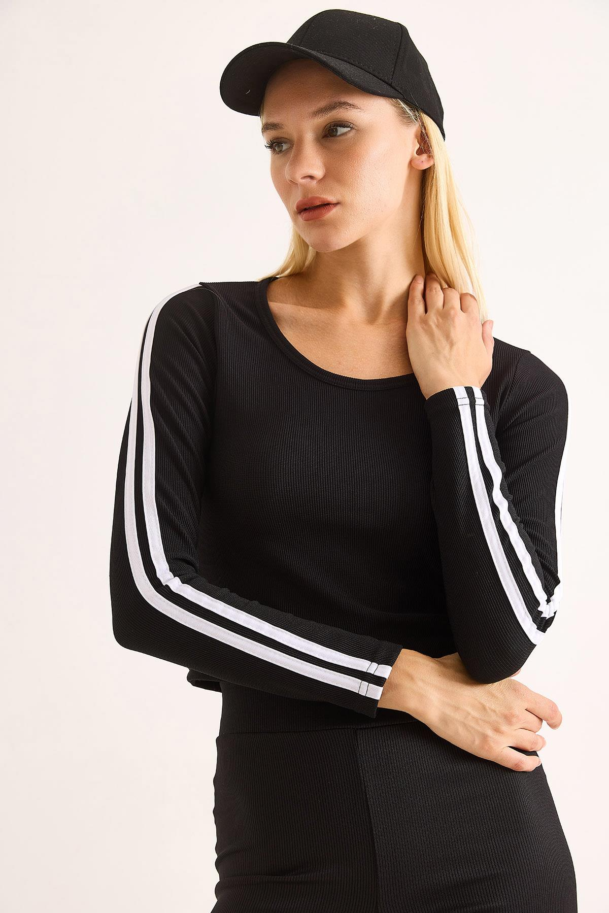 Kadın Kolları Şerit Çizgili  Bluz Siyah