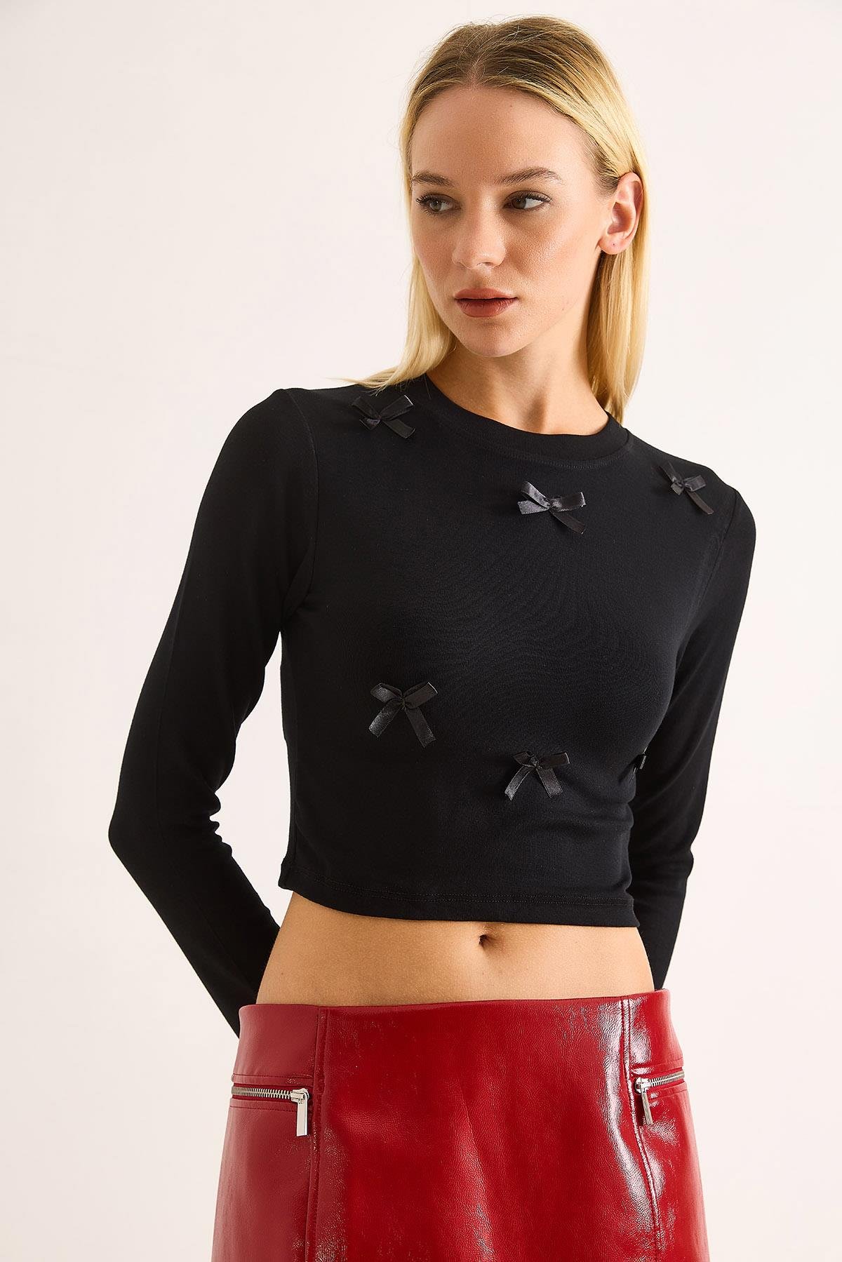 Kadın Kurdeleli Uzun Kollu Crop Bluz Siyah (500758BLZXSYH)