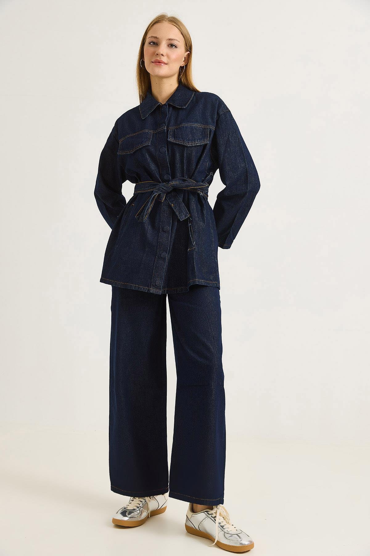 Kadın Kuşaklı Kot Ceket ve Pantalon Takım Lacivert (500735TKMXLCV)