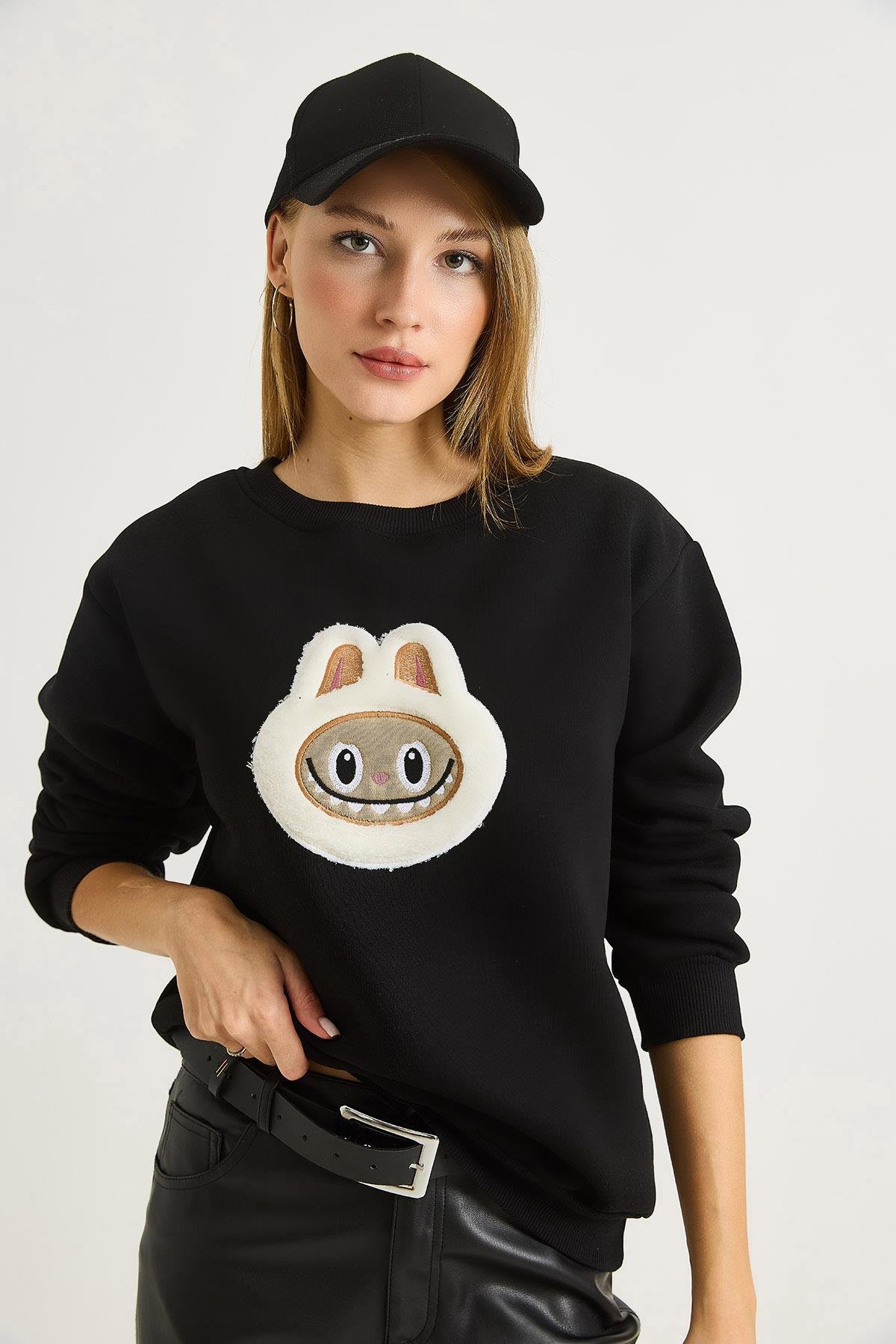 Kadın Labubu İşlemeli Üç İplik Sweatshirt Siyah