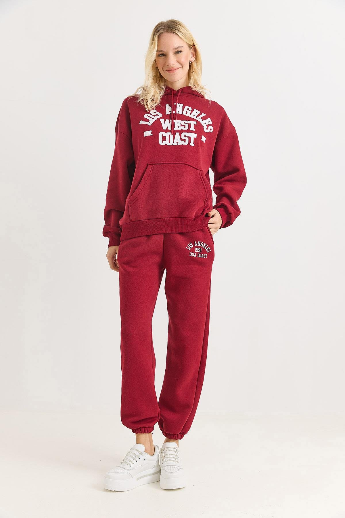 Kadın Los Angeles Baskılı Eşofman Takımı Üç İplik Bordo