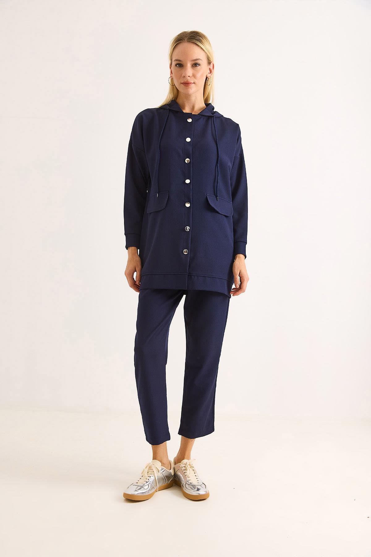 Kadın Metal düğmeli Scuba İkili Takım Lacivert