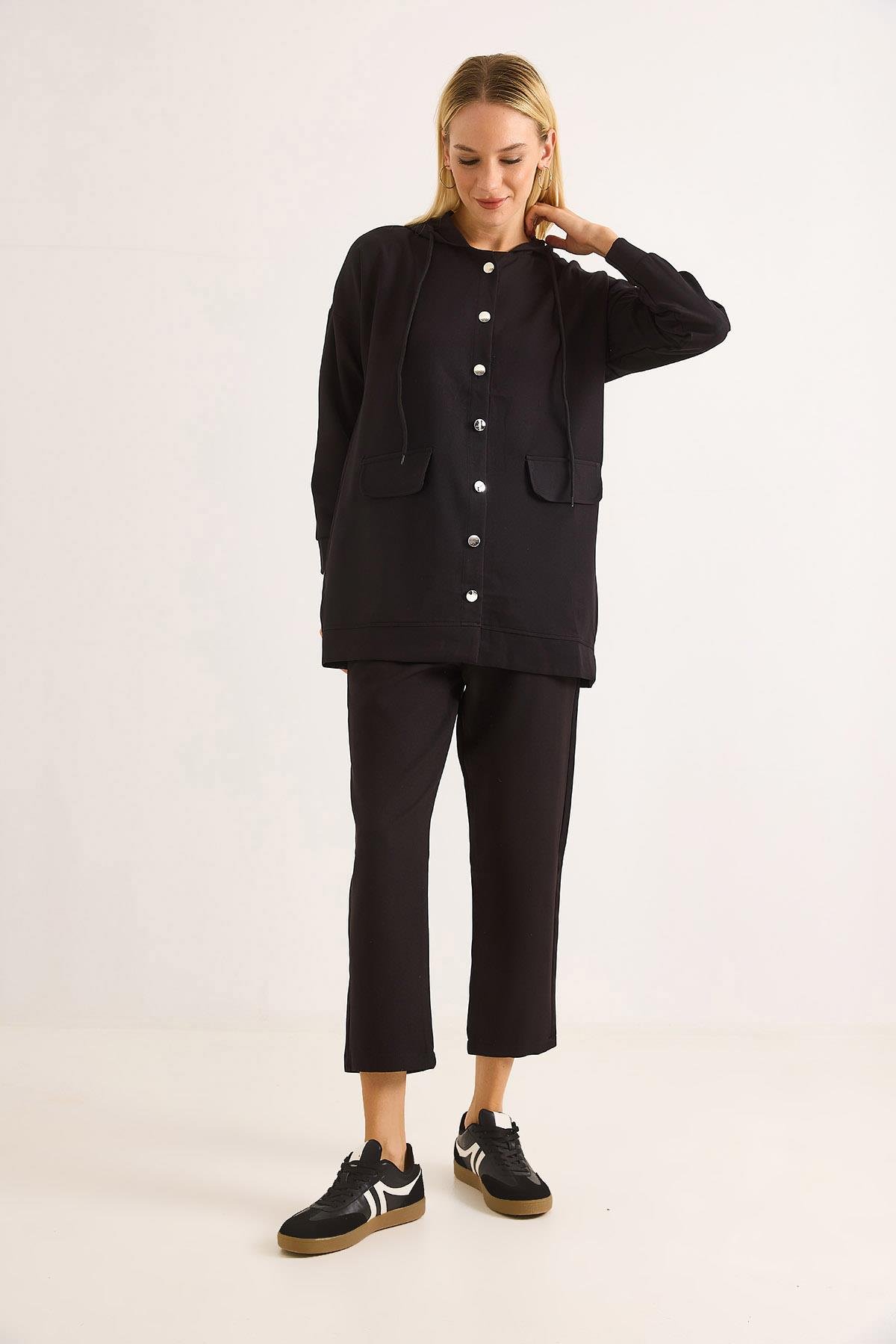 Kadın Metal düğmeli Scuba İkili Takım Siyah (500763TKMXSYH)