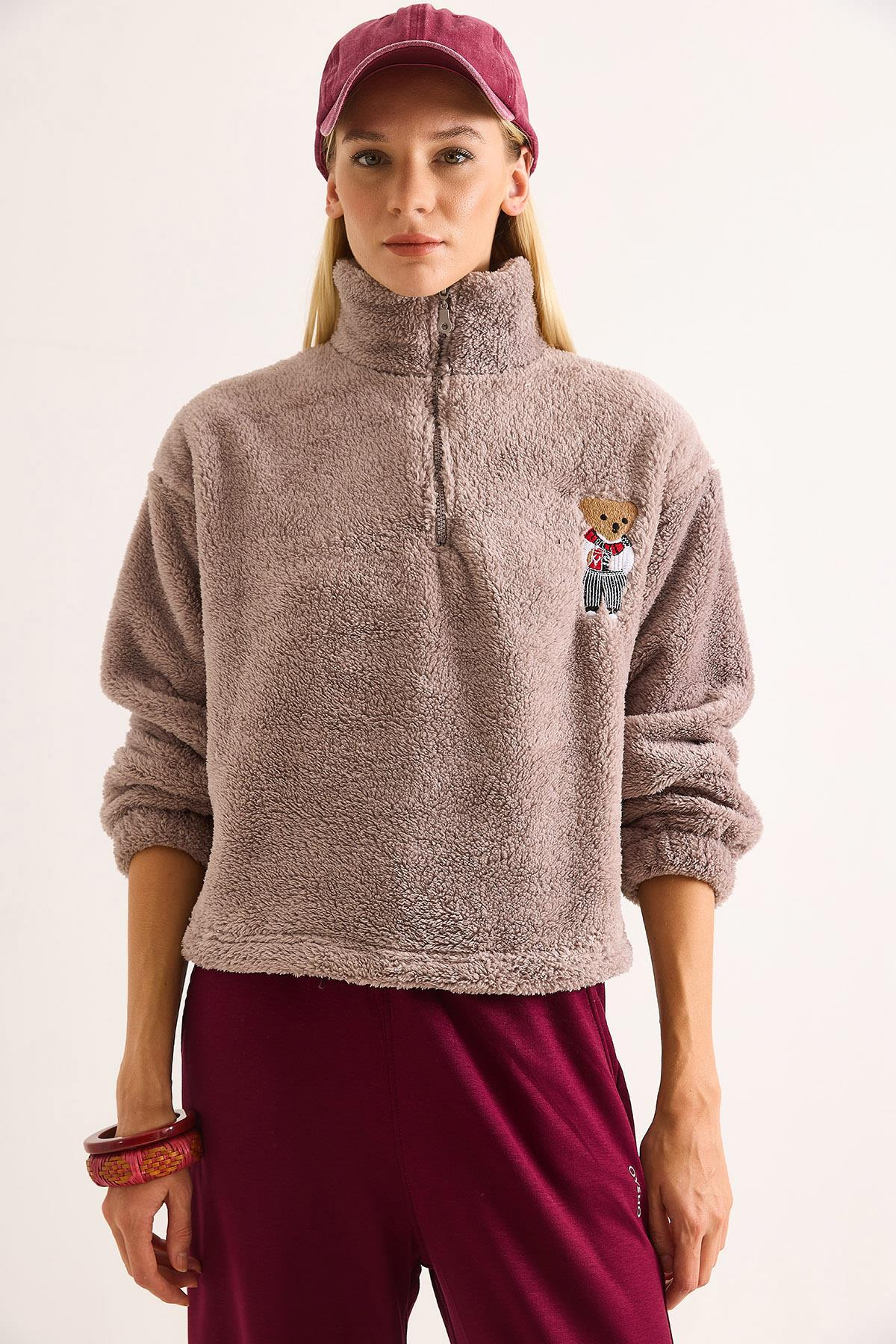 Kadın Nakışlı Welsoft  Fermuar Detaylı Sweat Açık Kahverengi