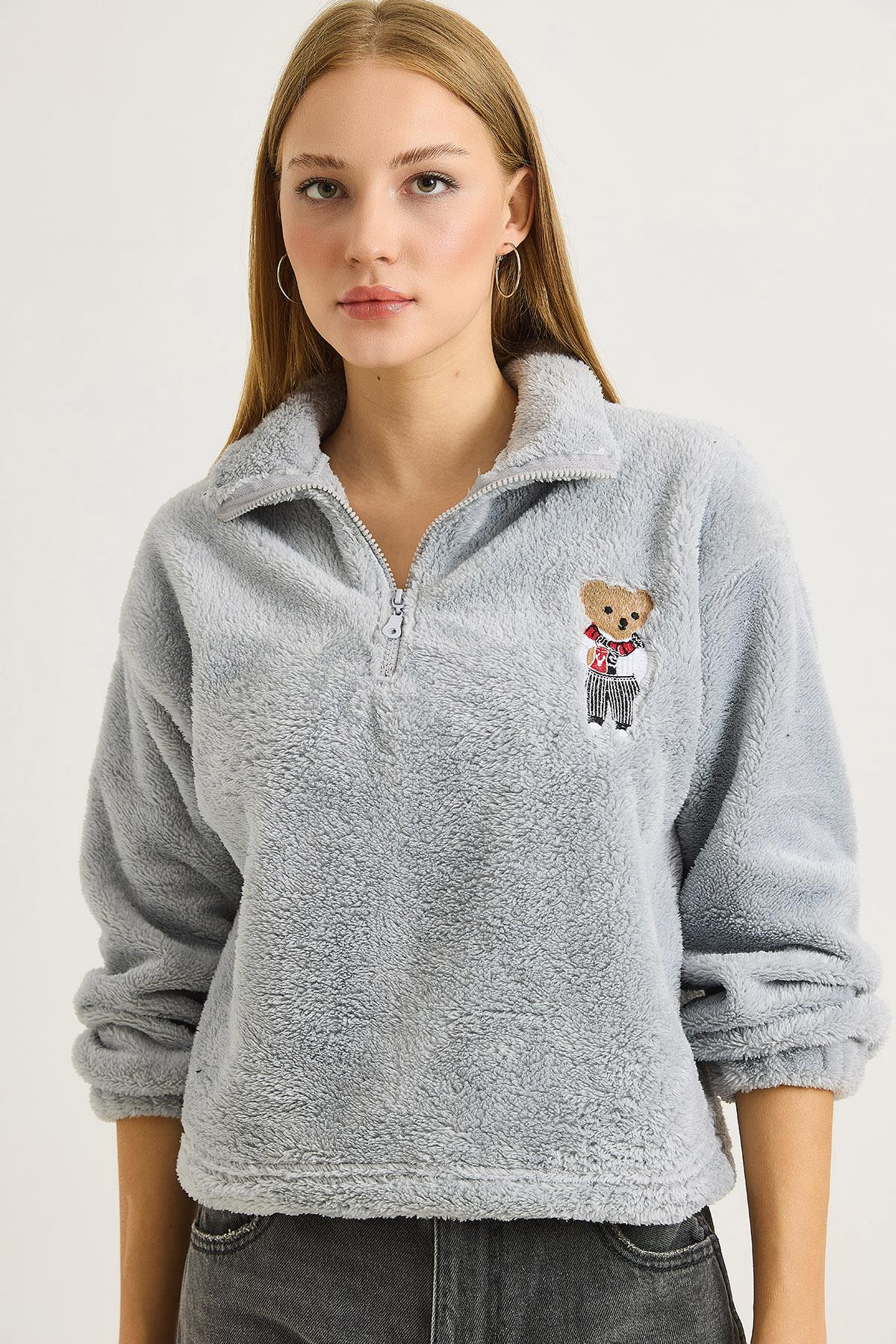 Kadın Nakışlı Welsoft Fermuar Detaylı Sweat Gri (500736SWTXGRİ)