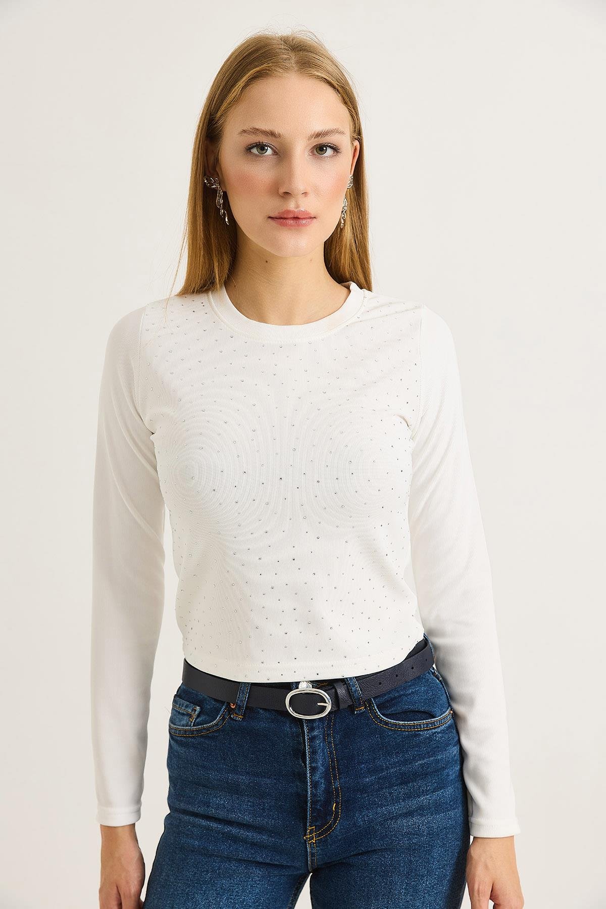 Kadın Ottoman Bisiklet Yaka Taşlı Bluz Beyaz (500739BLZXBYZ)