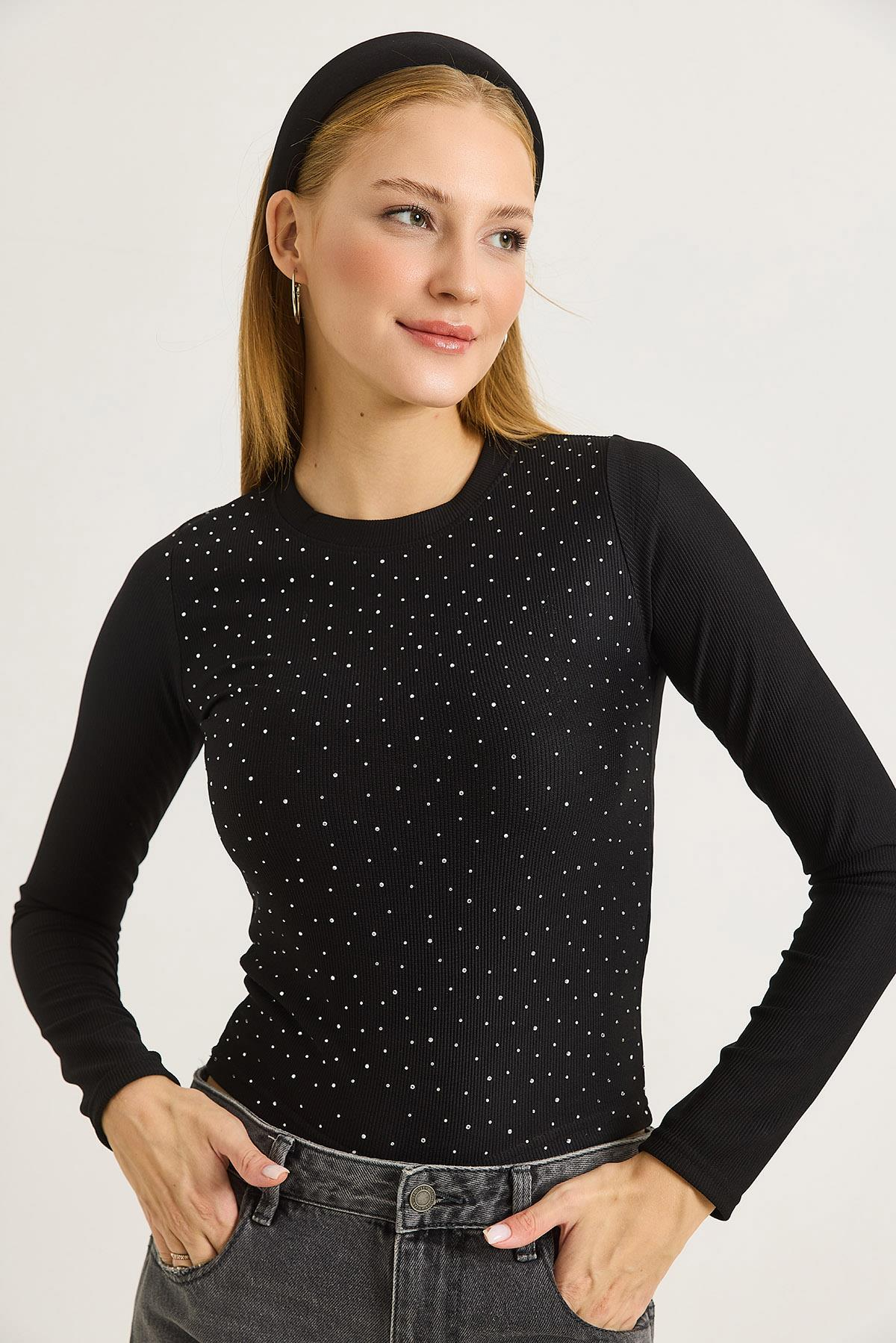 Kadın Ottoman Bisiklet Yaka Taşlı Bluz Siyah