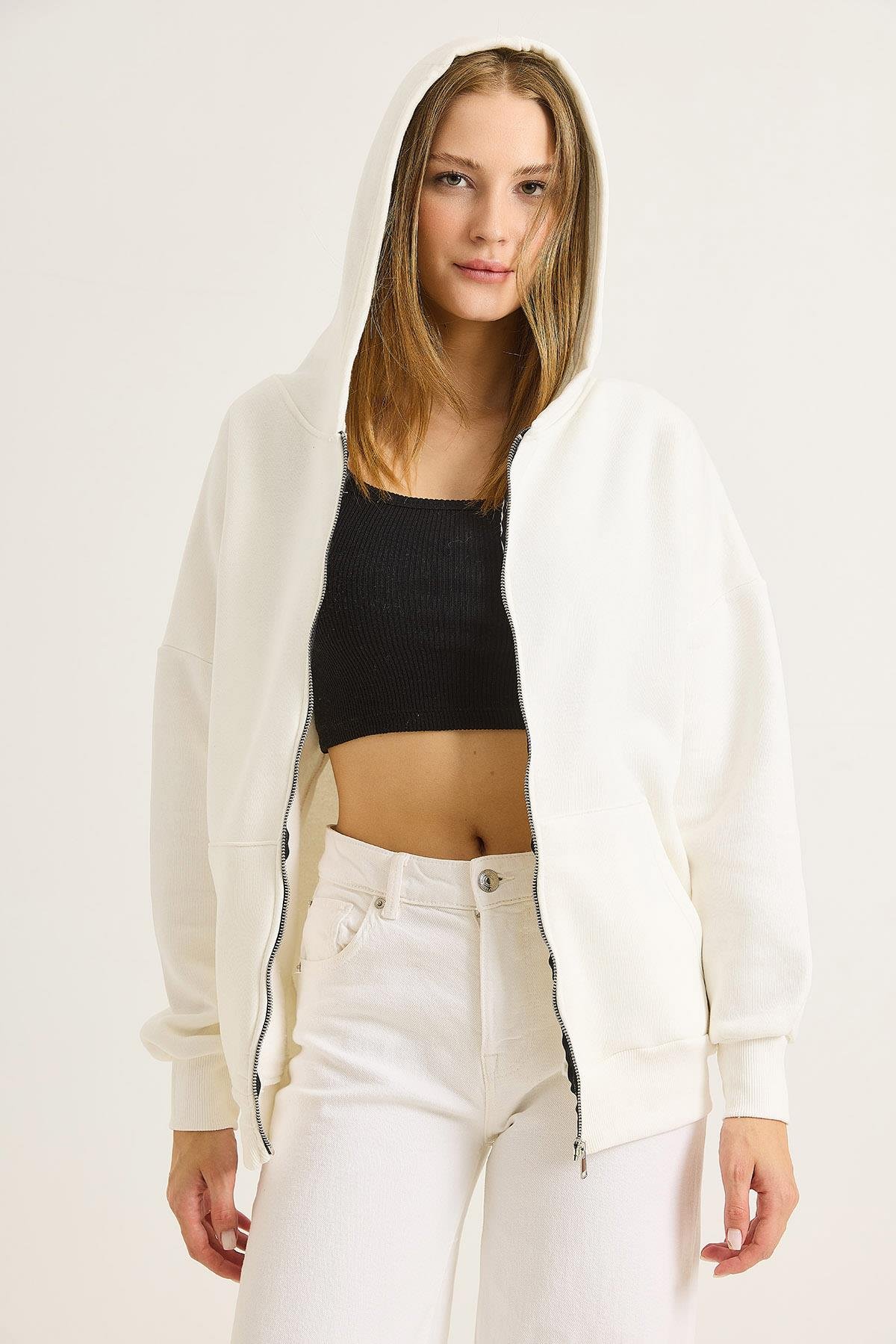 Kadın Oversize Kapüşonlu Fermuarlı Hırka Beyaz (500720HRKXBYZ)