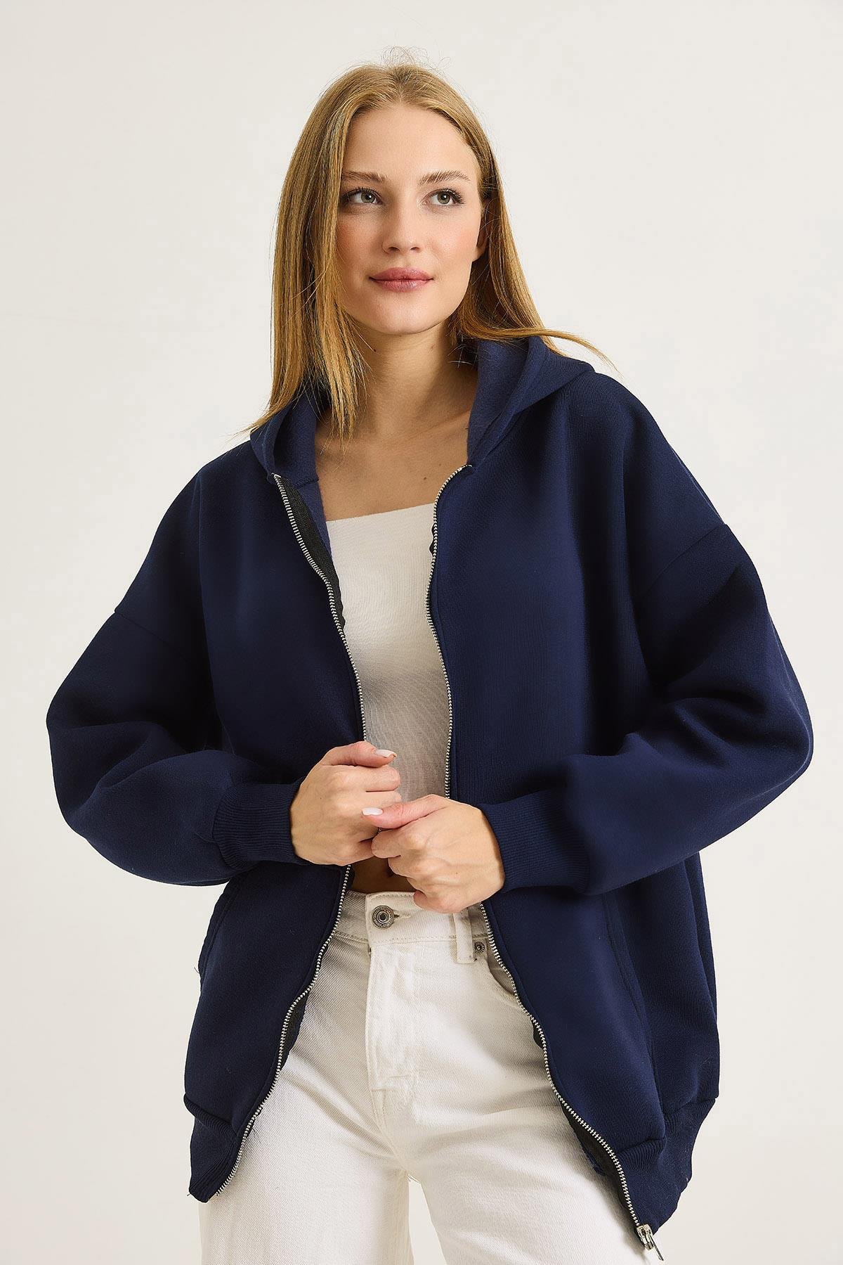 Kadın Oversize Kapüşonlu Fermuarlı Hırka Lacivert (500720HRKXLCV)