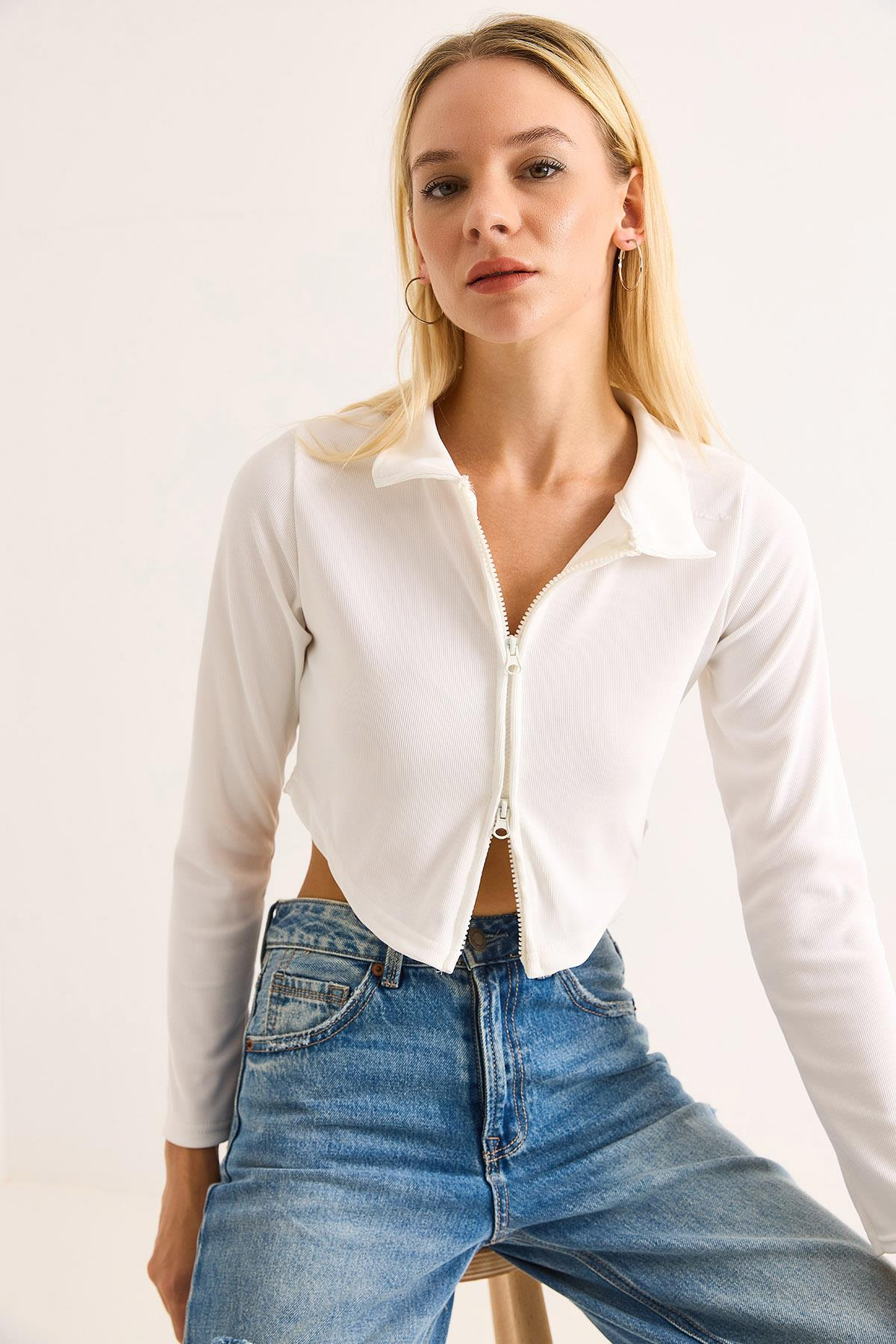 Kadın Polo Yaka Fermuarlı Fitilli Kaşkorse Crop Beyaz (500759BLZXBYZ)