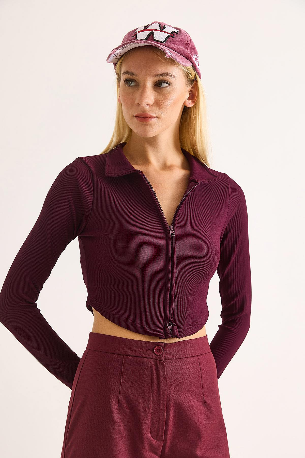 Kadın Polo Yaka Fermuarlı Fitilli Kaşkorse Crop Bordo (500759BLZXBRD)