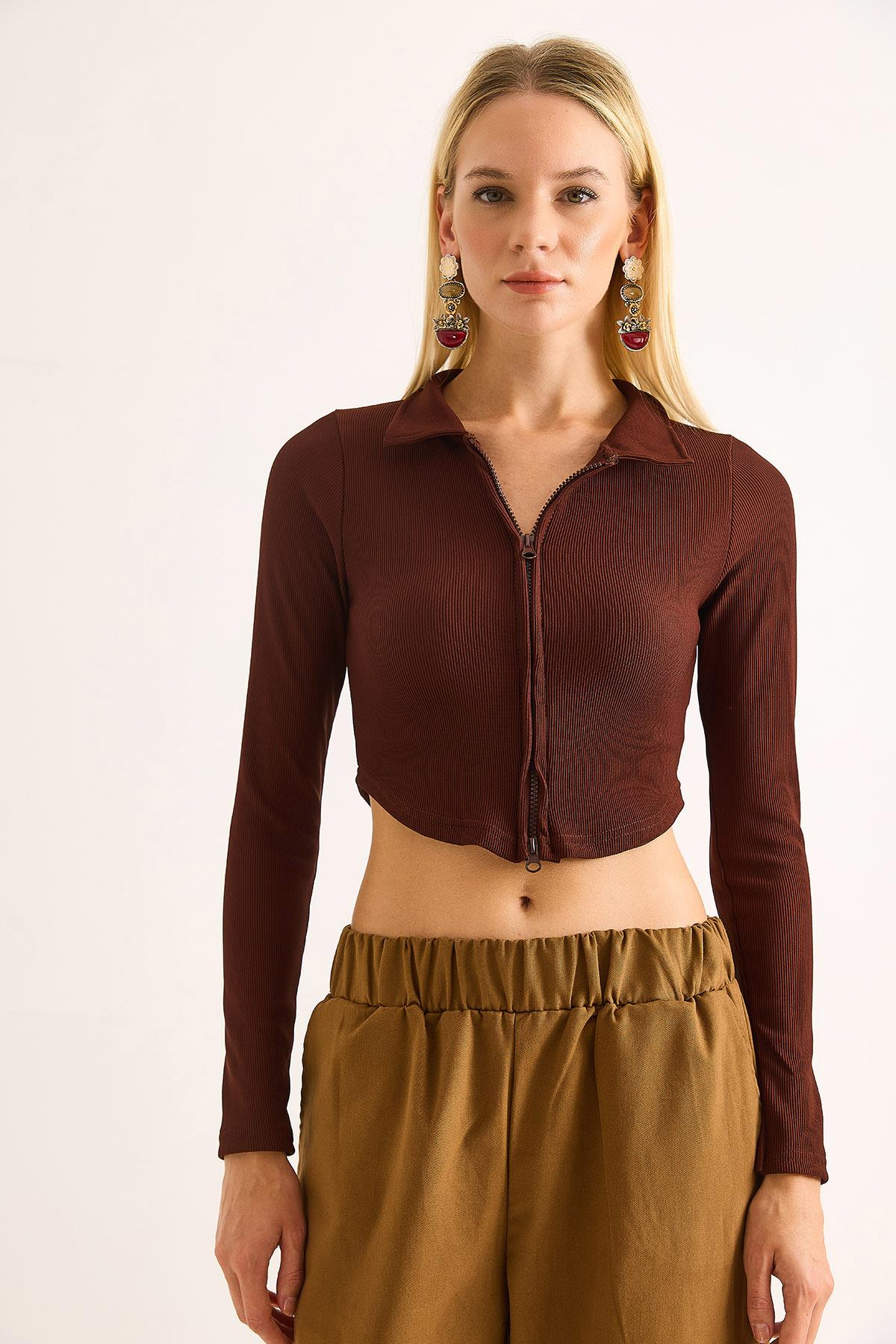 Kadın Polo Yaka Fermuarlı Fitilli Kaşkorse Crop Kahverengi (500759BLZXKHV)