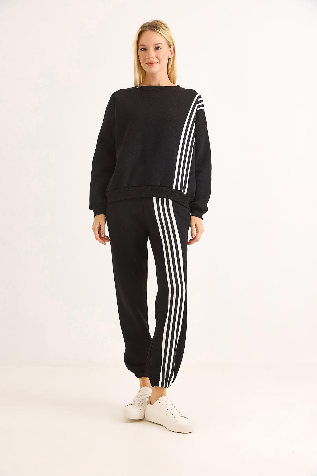 Kadın Şerit Nakışlı Şardonlu Üç İplik Eşofman Takımı Siyah (500756EŞFXSYH)