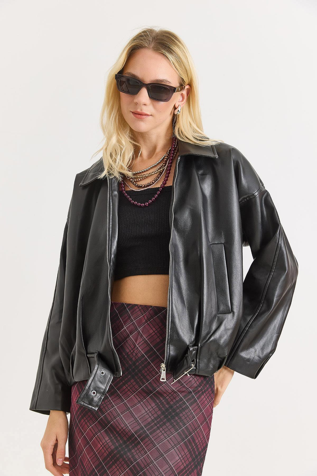 Kadın Şık Suni Deri Fermuarlı Siyah Mont (500801MNTXSYH)