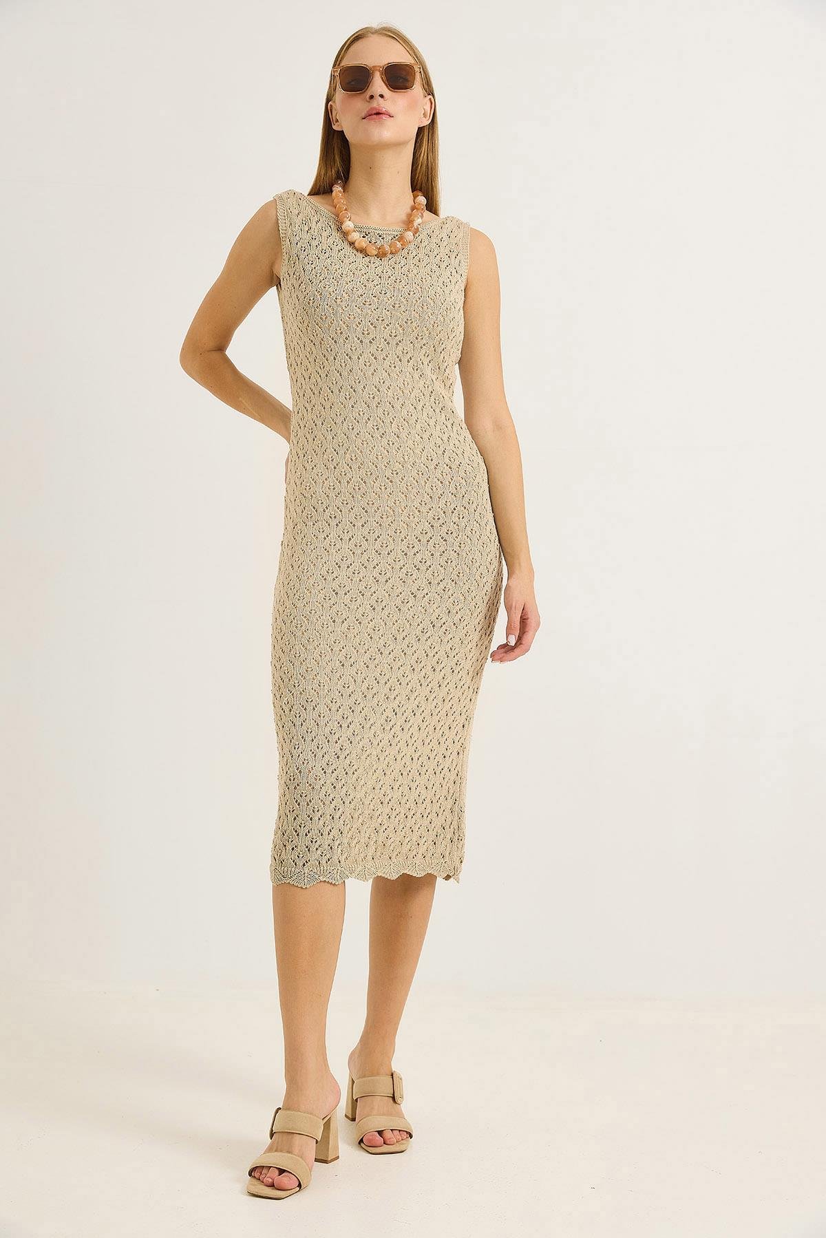 Kadın Sırt Dekolteli Ajurlu Triko Elbise Bej